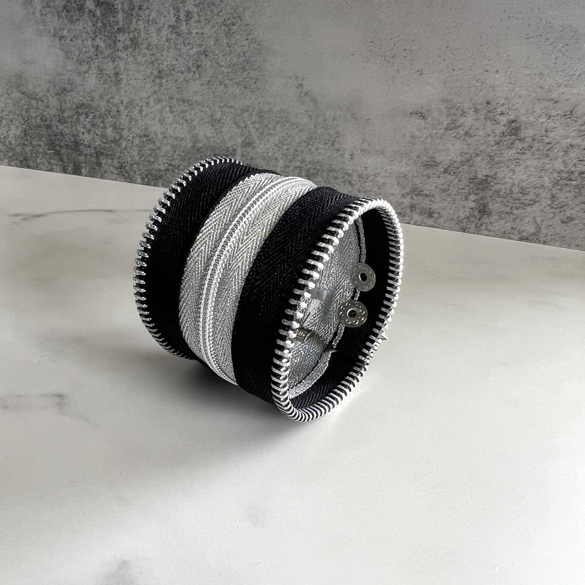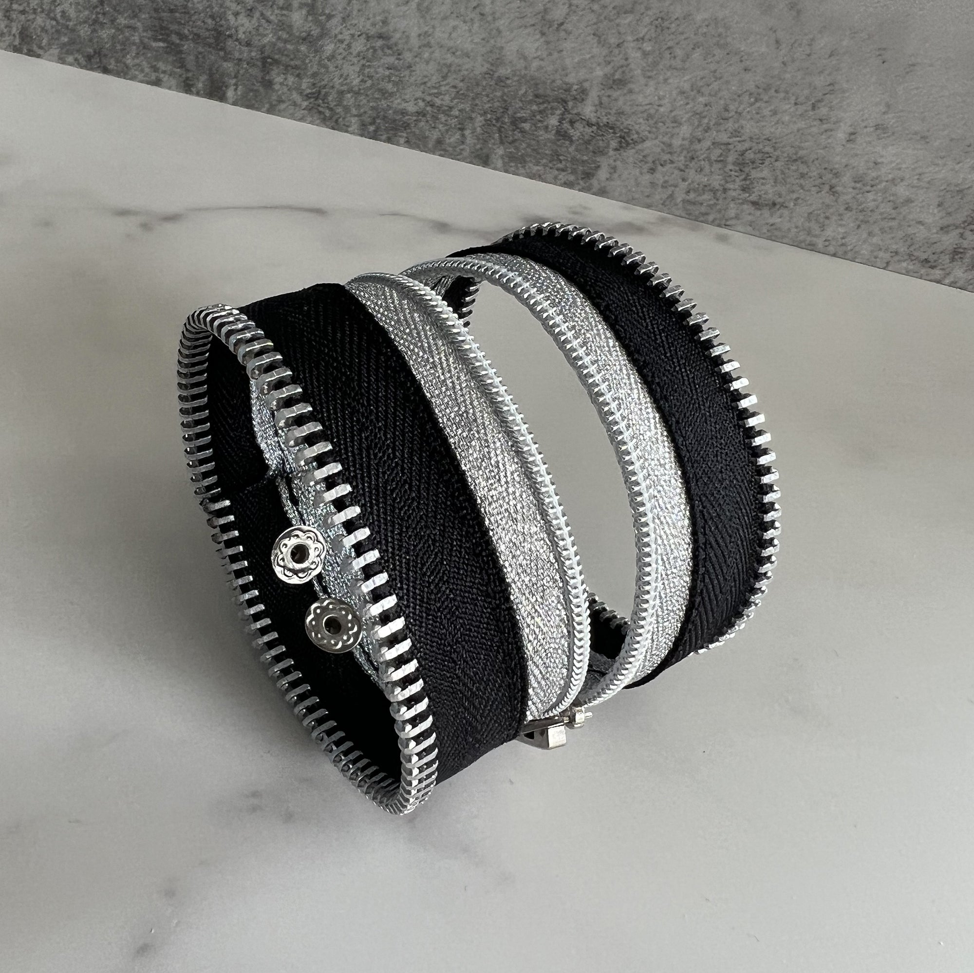 $25.00 USD$0.00 USDAvailable: In stockZipper bracelet in honor of the Las Vegas Raiders football team. Wear it 3 ways: closed, open or twisted! Silver metallic inner zipper with silver teeth. Black outer zipper with silver teeth. Black topstitch. Silver snaps. Silver zipper pull. Bracelet width: 1.75" Size: Adjustable two ways, 6.75" and 7.25" (Small to...