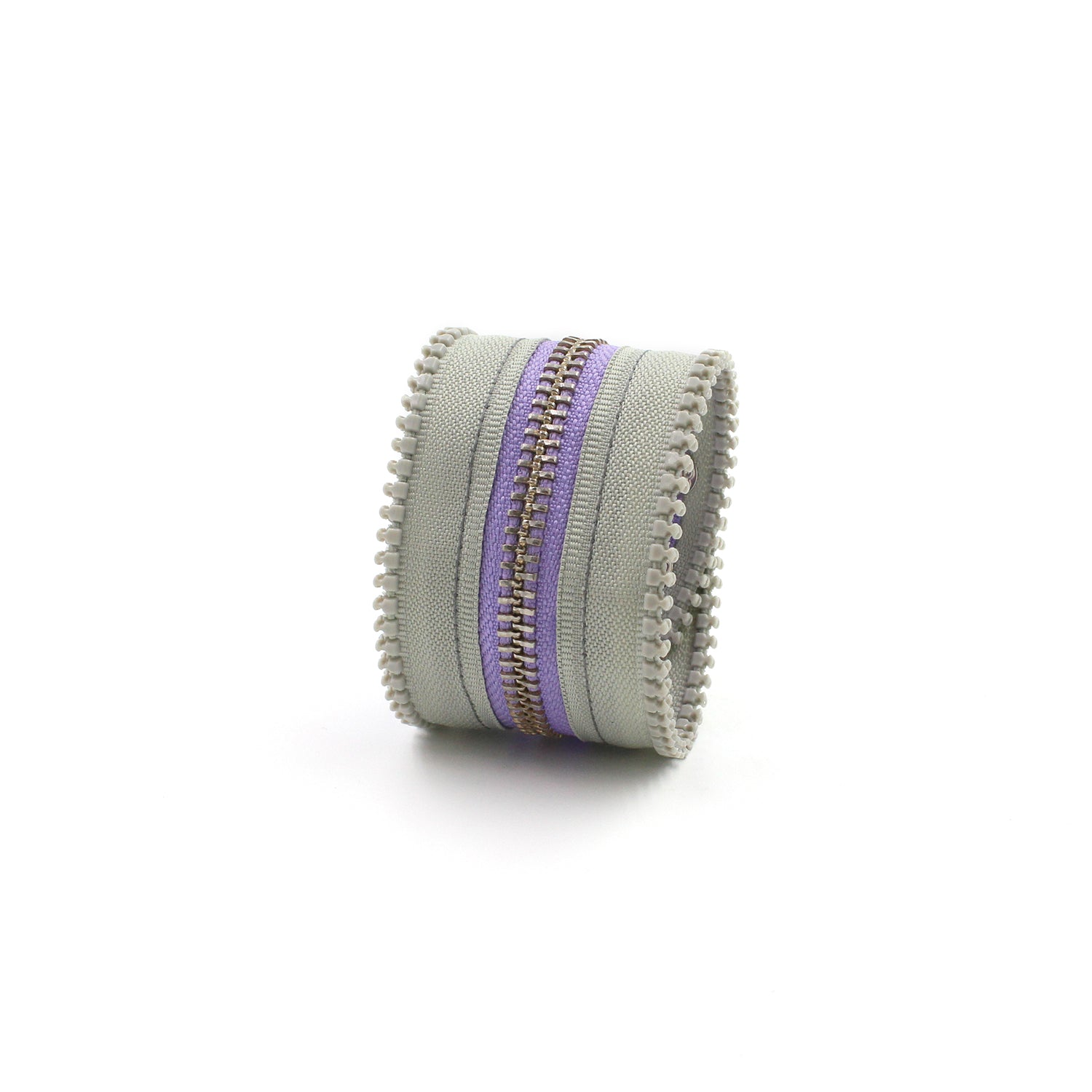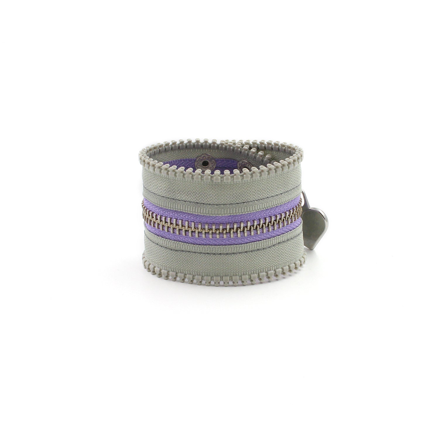 $30.00 USD$0.00 USDAvailable: In stockGrey and Lilac ♡ zipper bracelet. Lilac purple inner zipper with nickel teeth. Light grey outer zipper with light grey teeth. Grey topstitch. Nickel snaps. Silver heart zipper pull charm. Bracelet width: 1.75" Size: Adjustable 2 ways, 6" and 6 3/4" (Small)