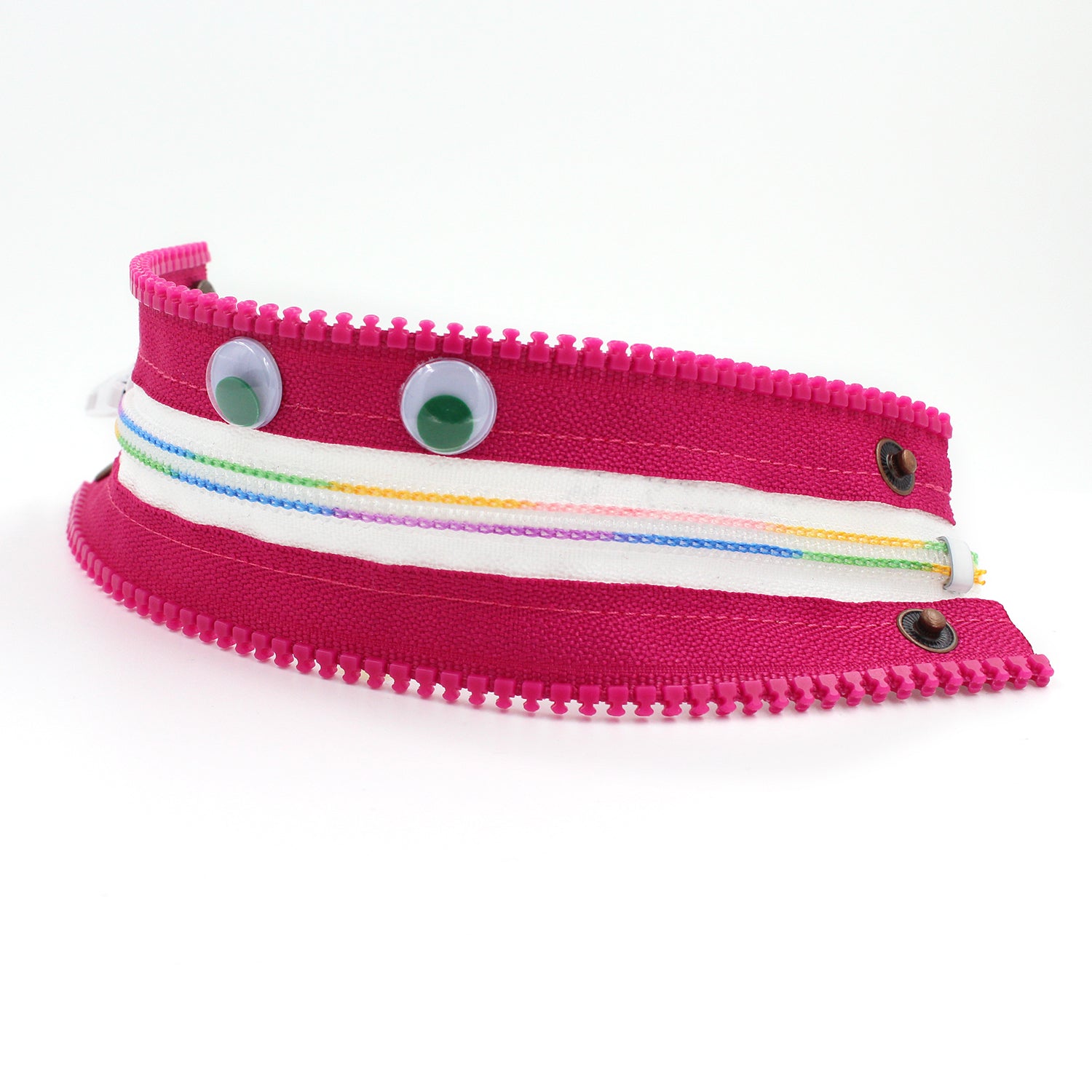$25.00 USD$0.00 USDAvailable: In stockIntroducing the fun and whimsical "Monster" zipper bracelets! White inner zipper with rainbow teeth. Magenta pink outer zipper with magenta teeth. Hot pink topstitch. Copper snaps. Green Monster Eyes. White classic zipper pull. Bracelet width: 1.75" Size: 6.75" (Small)