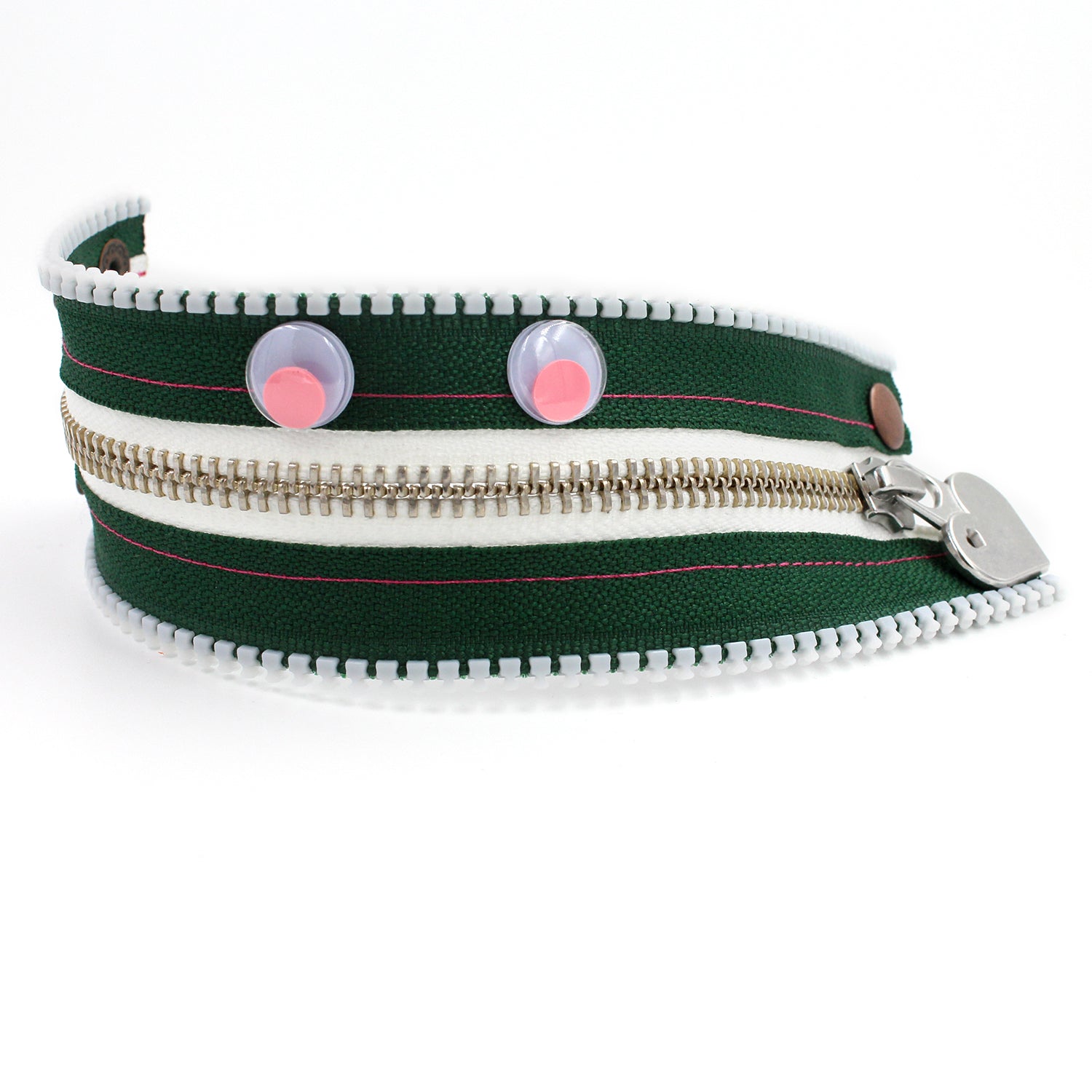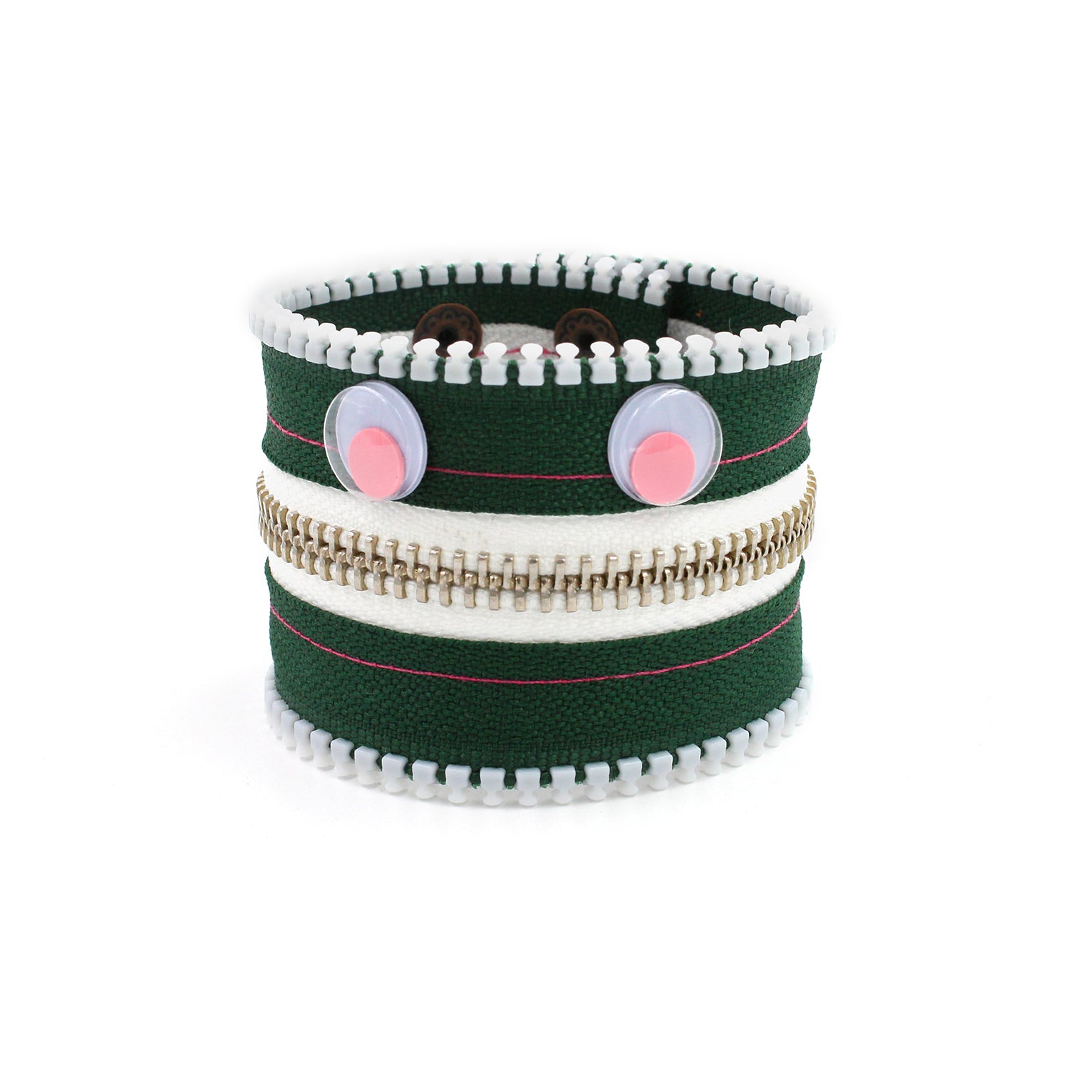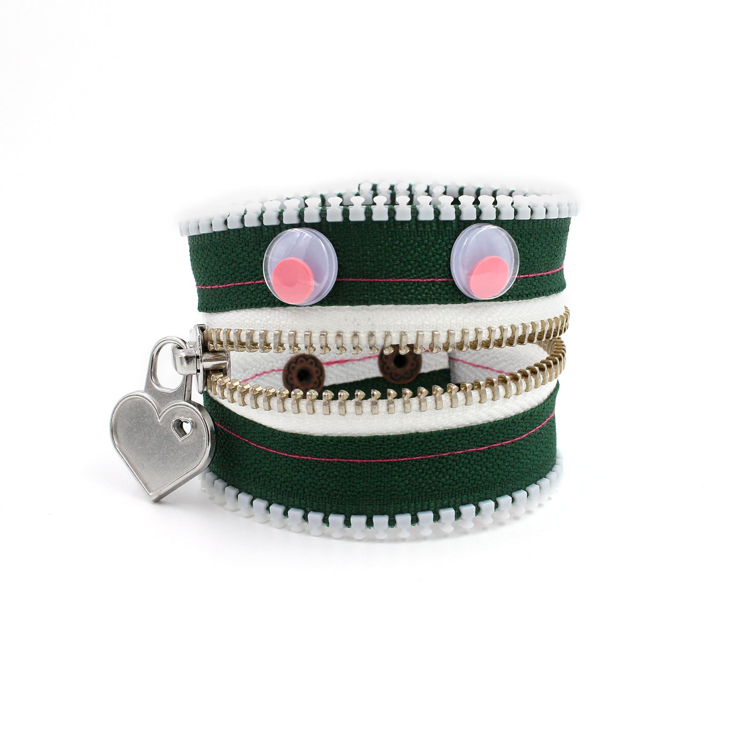 $30.00 USD$0.00 USDAvailable: In stockIntroducing the fun and whimsical "Monster" zipper bracelets! White inner zipper with nickel teeth. Forest green outer zipper with white teeth. Hot pink topstitch. Copper snaps. Pink Monster Eyes. Silver heart zipper pull. Bracelet width: 1.75" Size: Adjustable 2 ways, 6.5" and 7.25" (Small to Medium)