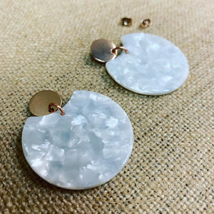 Handmade acrylic resin laser-cut white circle cut-out tortoise shell drop earrings, rose gold-plated stainless steel posts with butterfly push-back closure.