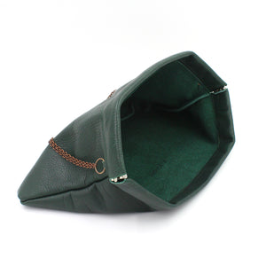 Dark green super soft genuine leather snap frame clutch with rose gold chain attachment on one side.