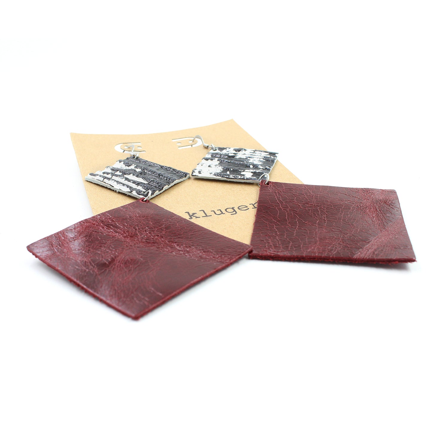 Handmade drop earrings with large red leather square and smaller black and white textured (handpainted) leather square.