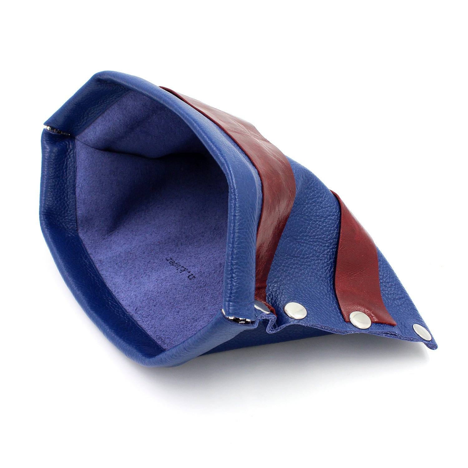 $75.00 USD$0.00 USDAvailable: In stockRetro vibe is alive and well with this snap frame clutch. Royal blue leather snap frame clutch with polished nickel rivets and red leather embellishments. Size: 12" x 6.5"