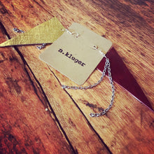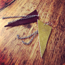 $25.00 USD$0.00 USDAvailable: In stockPunk rock handmade triangle shaped red leather dangling earrings with gold leather on opposite side and steel chain accent. Nickel-free stainless steel posts. Total length: Approximately 3.5"