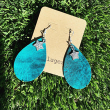 Distressed Teal Leather Drop Star Earrings with Red Glitter Backside