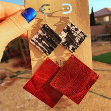 $20.00 USD$0.00 USDAvailable: In stockHandmade drop earrings with large red leather square and smaller black and white textured (handpainted) leather square. Nickel-free stainless steel ear wires. Size: 5" total drop. 2.75" width at widest point.