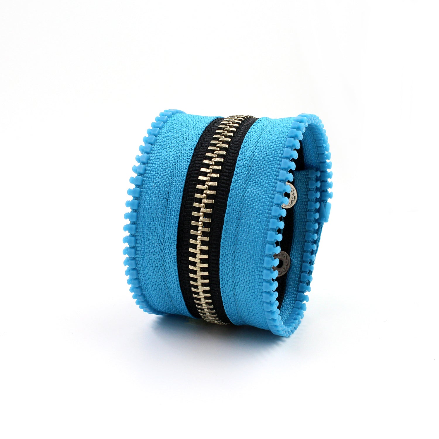 $30.00 USD$0.00 USDAvailable: In stockJust because it's not pink, doesn't mean it can't = ♡ zipper bracelet. Black inner zipper with nickel teeth. Aqua blue outer zipper with aqua teeth. Aqua topstitch. Black snaps. Nickel classic zipper pull with silver and black heart charms. Bracelet width: 1.75" Size: Adjustable 2 ways, 7.5" and...