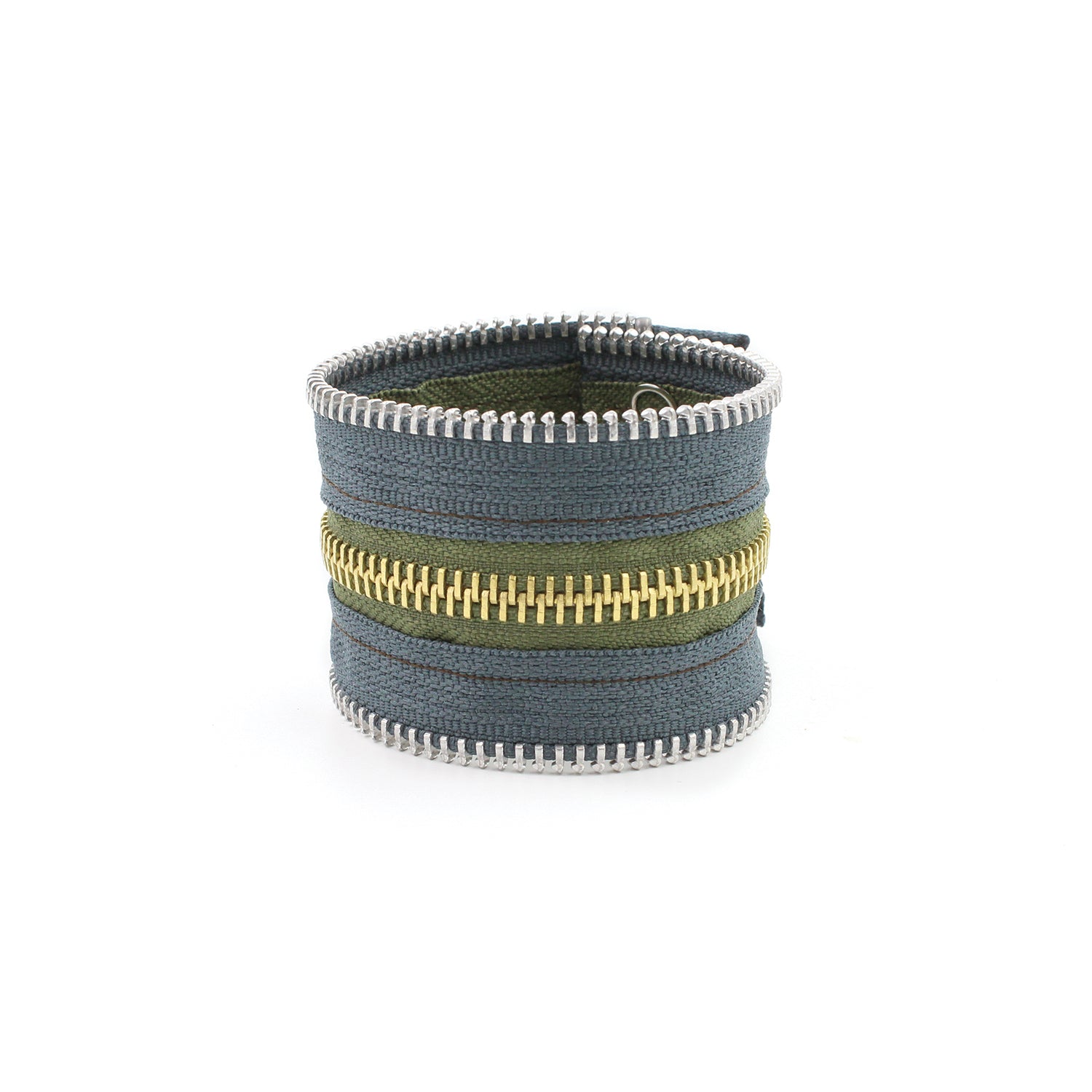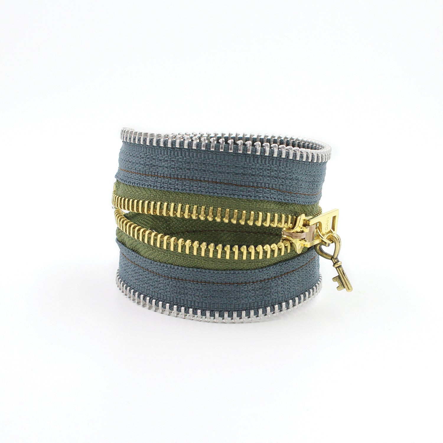 $30.00 USD$0.00 USDAvailable: In stockLand and sea hit the streets for this charming zipper bracelet. Olive green inner zipper with brass teeth. Jeans blue outer zipper with silver teeth. Brown topstitch. Blue snaps. Brass classic zipper pull with brass key charm. Bracelet width: 1.75" Size: 7.5" (Medium)