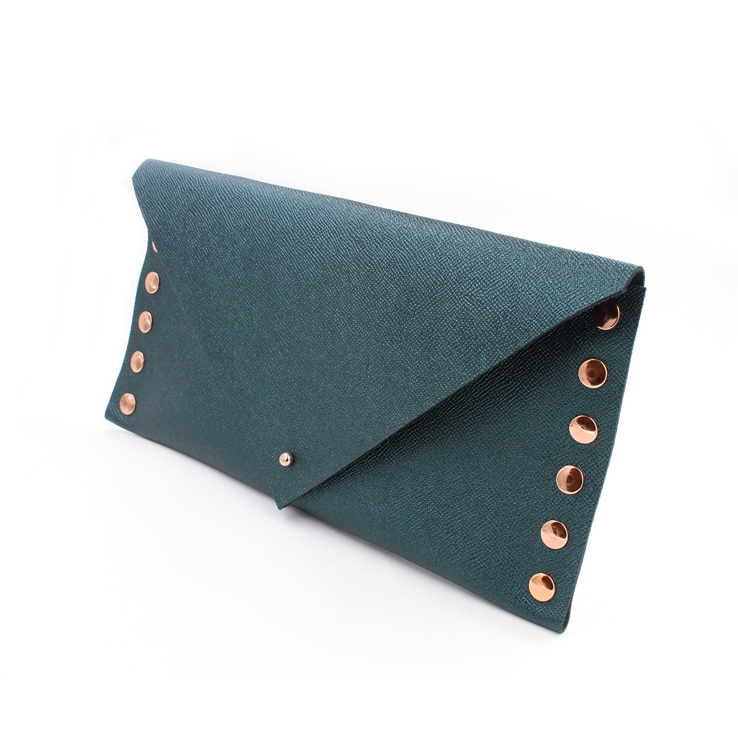 Shimmering Green/Blue Leather Clutch with Rose Gold Rivets