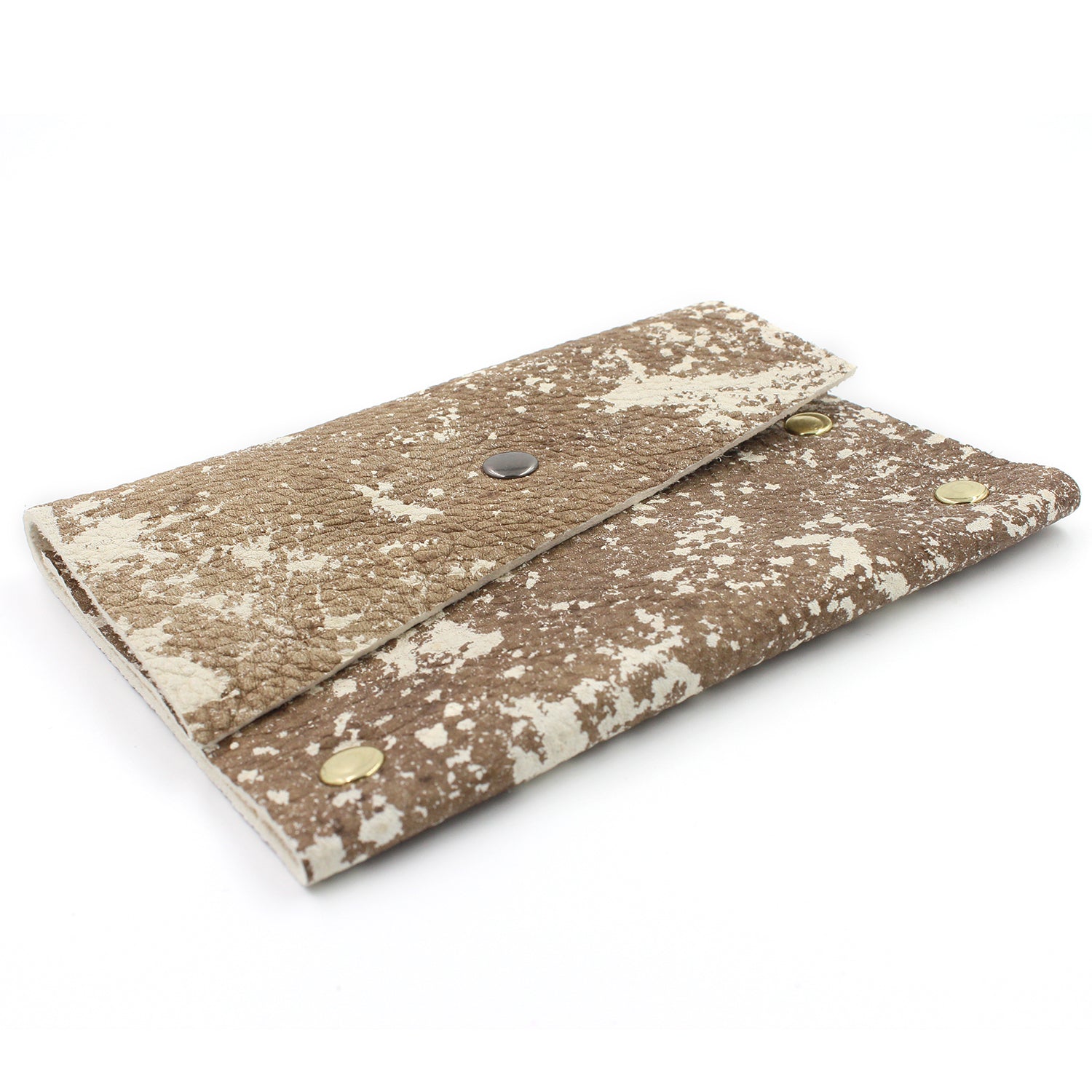 Brown speckled leather card case wallet with gunmetal snap closure and polished brass rivets. Cream color inside.