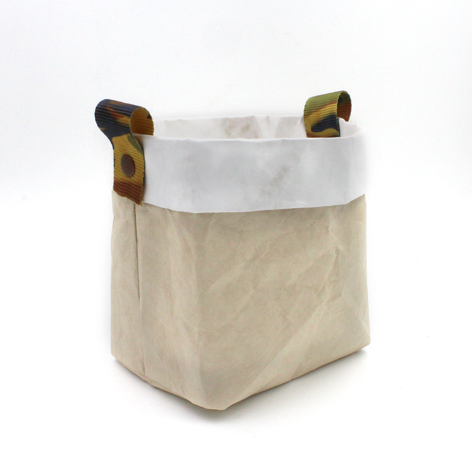 Made from Tyvek® durable paper in khaki with white interior, camo fabric with copper rivets.