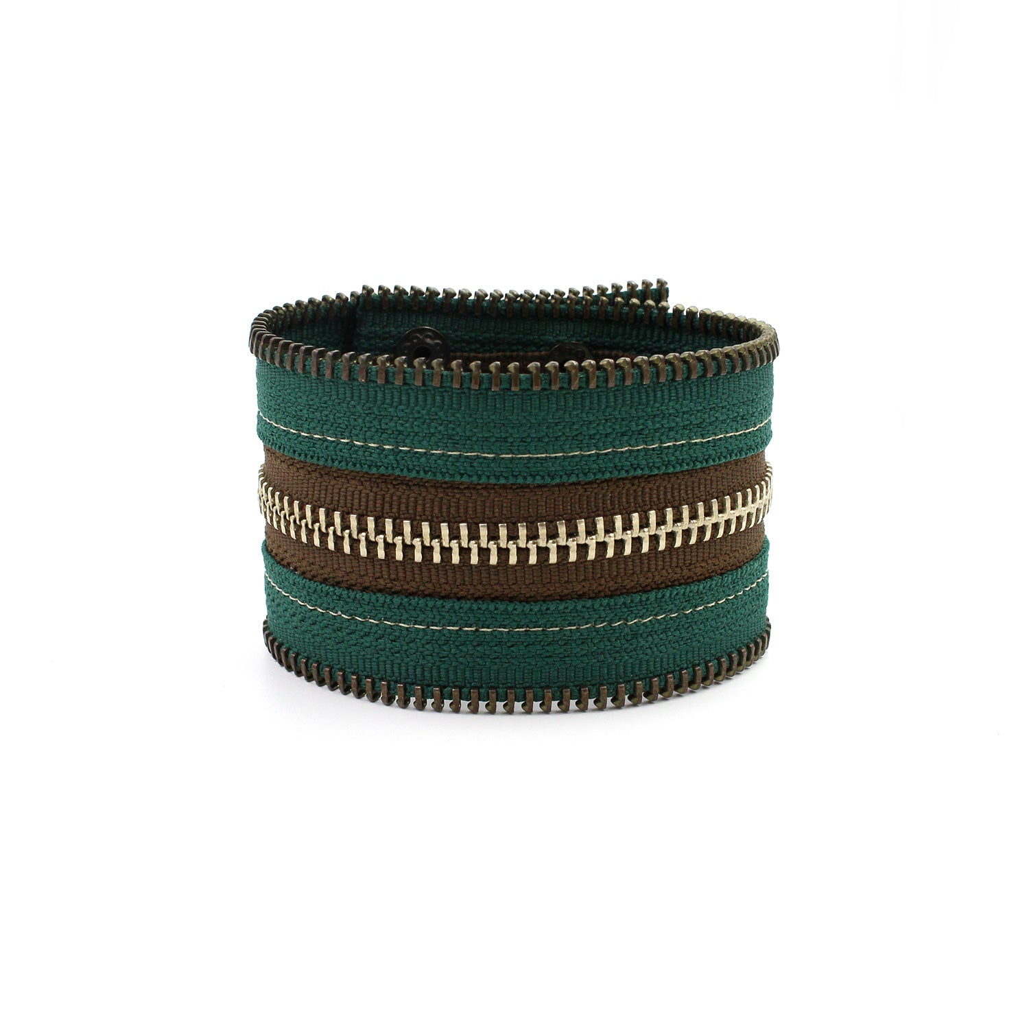 $20.00 USD$0.00 USDAvailable: In stockYou can feel the nuttiness zipper bracelet. Khaki inner zipper with antique gold teeth. Dark brown outer zipper with antique gold teeth. Khaki topstitch. Antique gold snaps. Antique gold zipper pull. Bracelet width: 1.75" Size: Adjustable two ways, 7" and 7.75" (Small/Medium to Large)