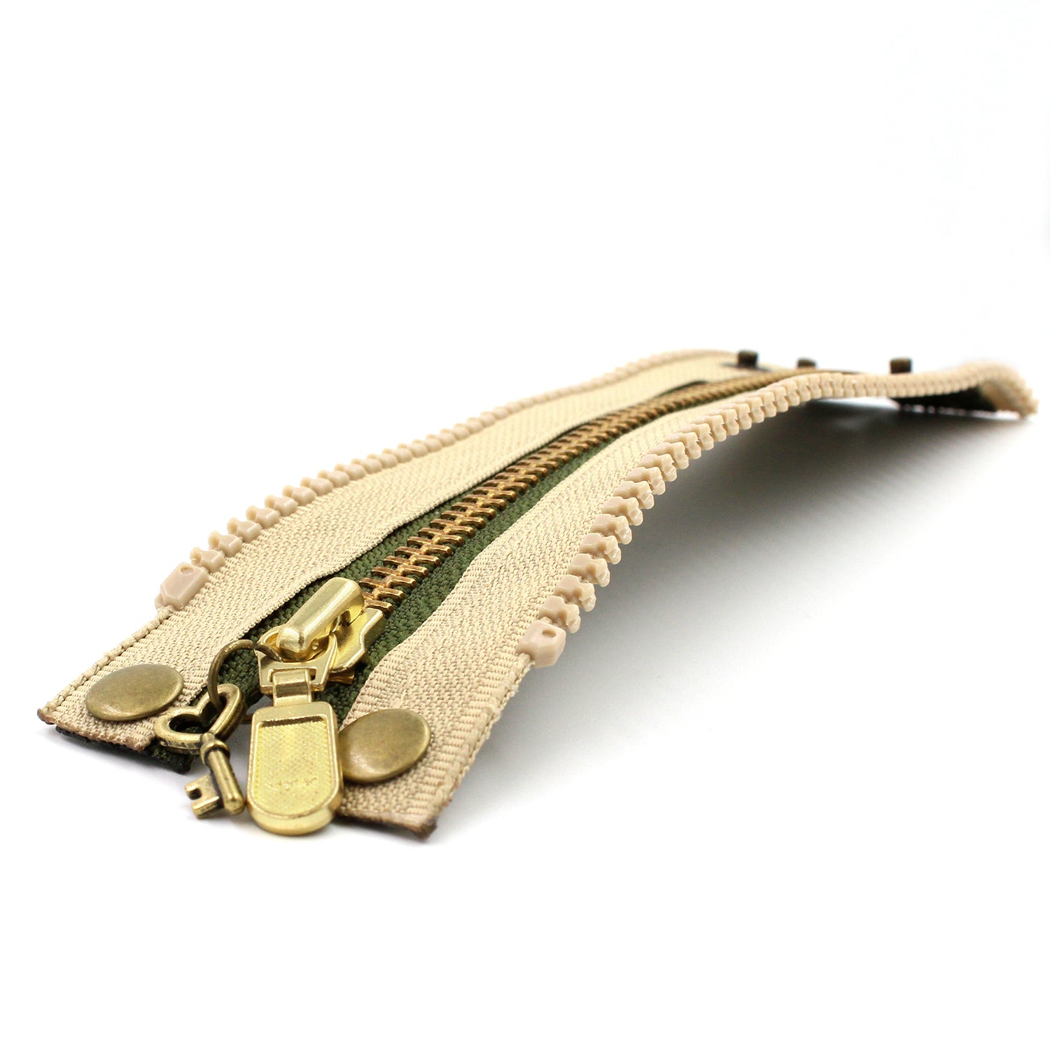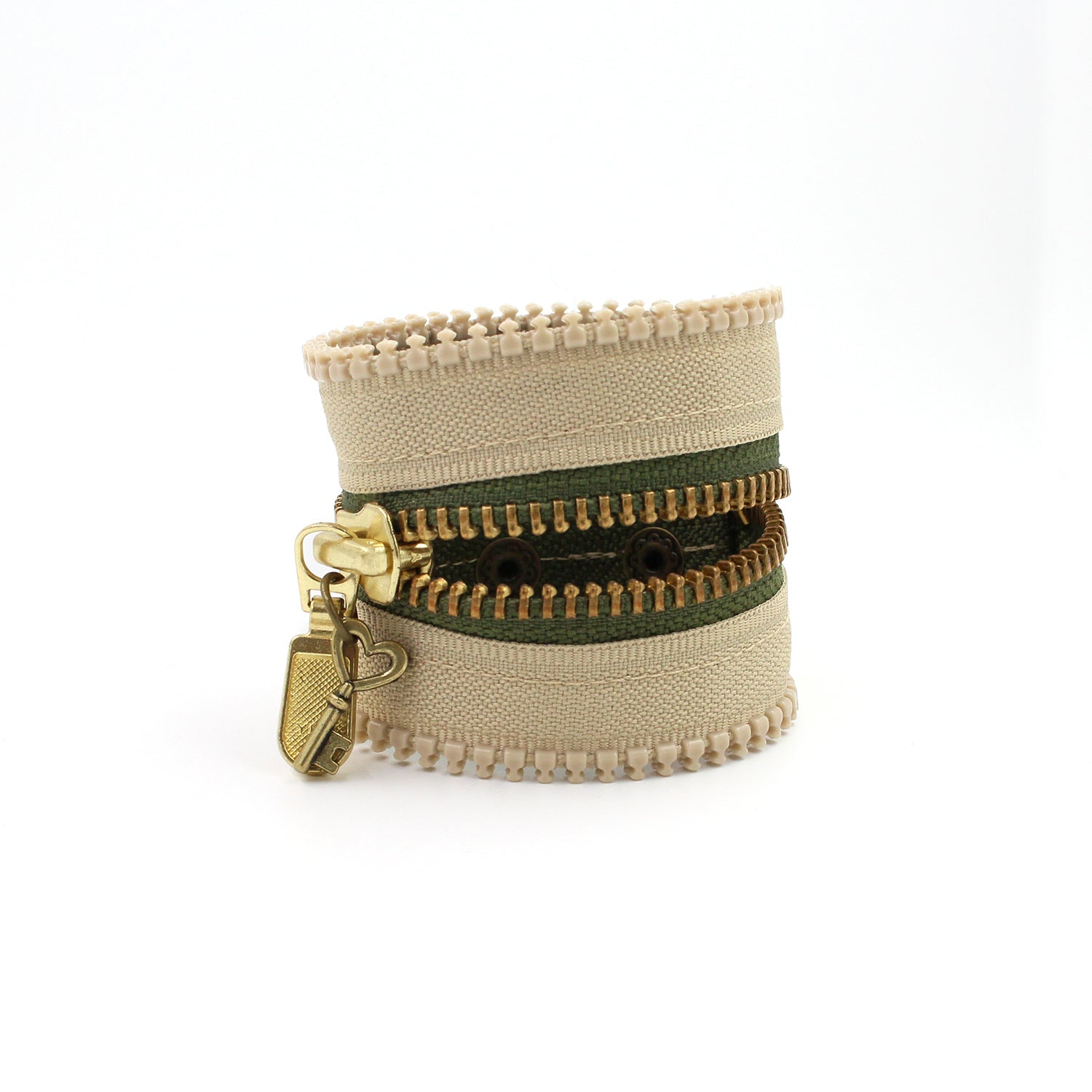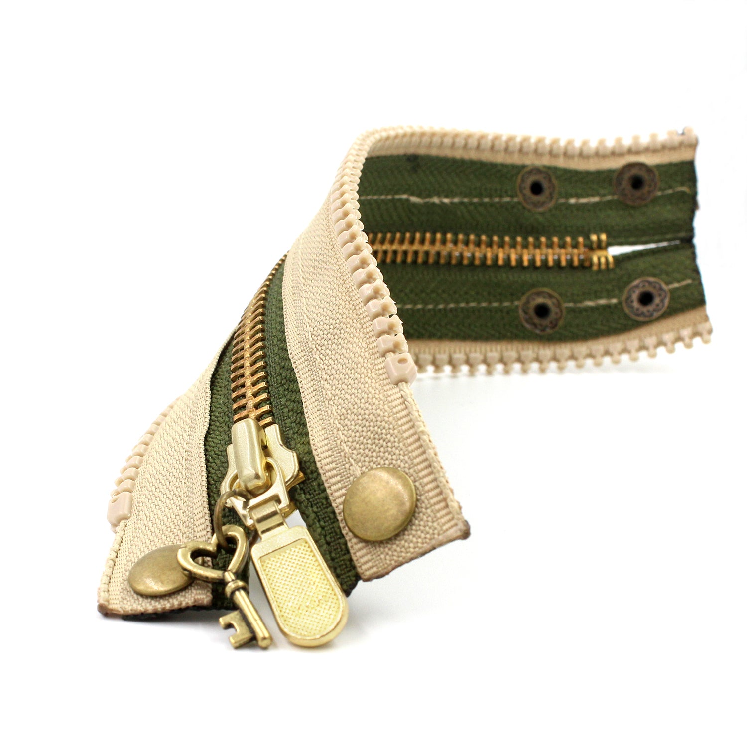 $30.00 USD$0.00 USDAvailable: In stockAny neutral gal's dream. Olive green inner zipper with brass teeth. Beige outer zipper with beige teeth. Beige topstitch. Antique gold snaps. Brass zipper pull with antique gold key charm. Bracelet width: 1.75" Size: Adjustable 2 ways - 5.75" and 6.5" (Small)
