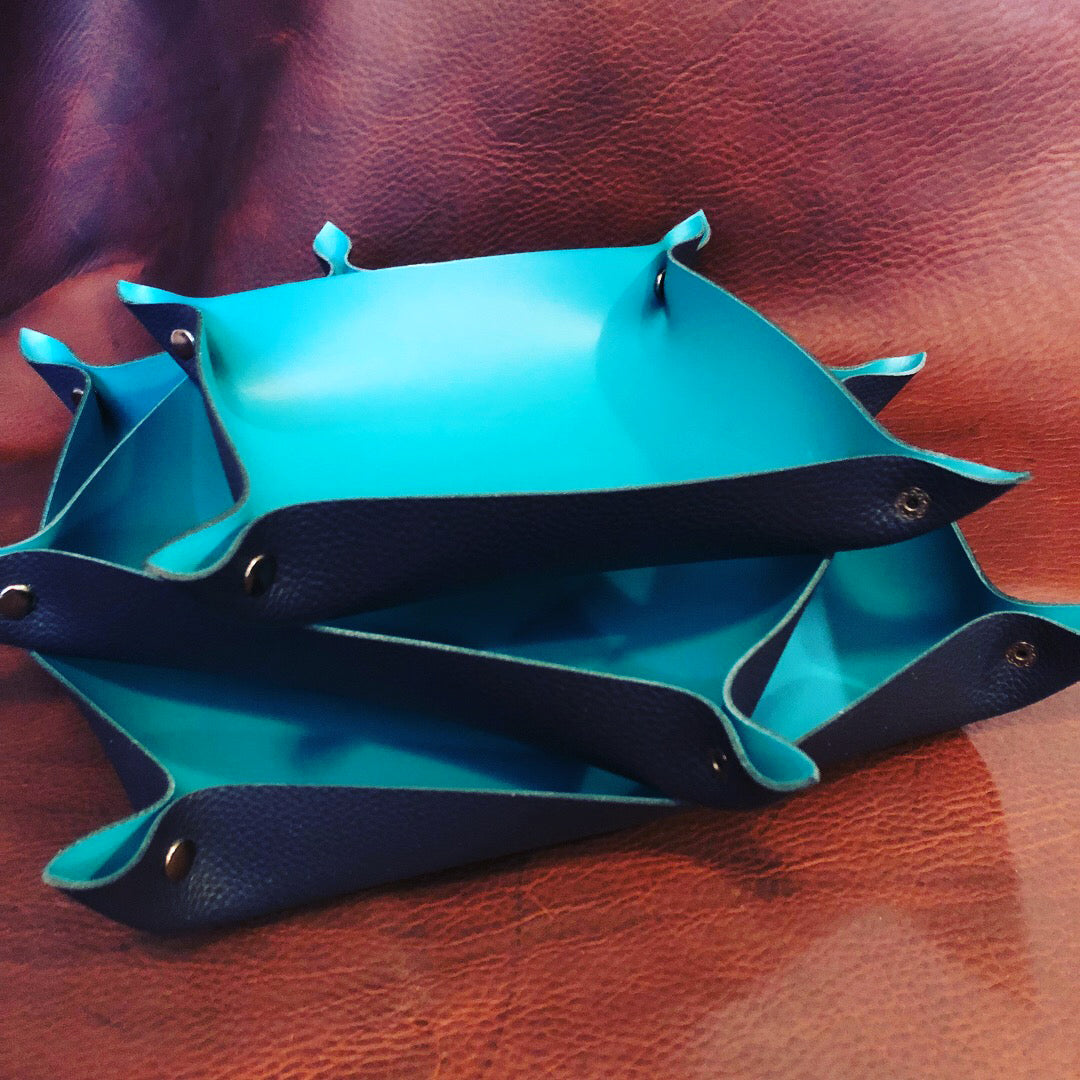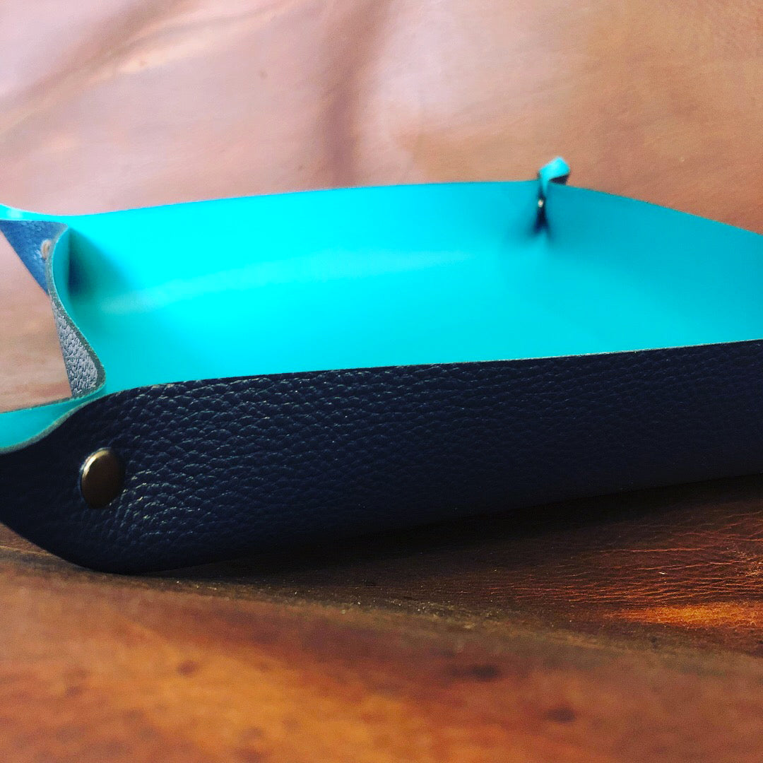 Navy textured leather with turquoise side. Gunmetal snaps.