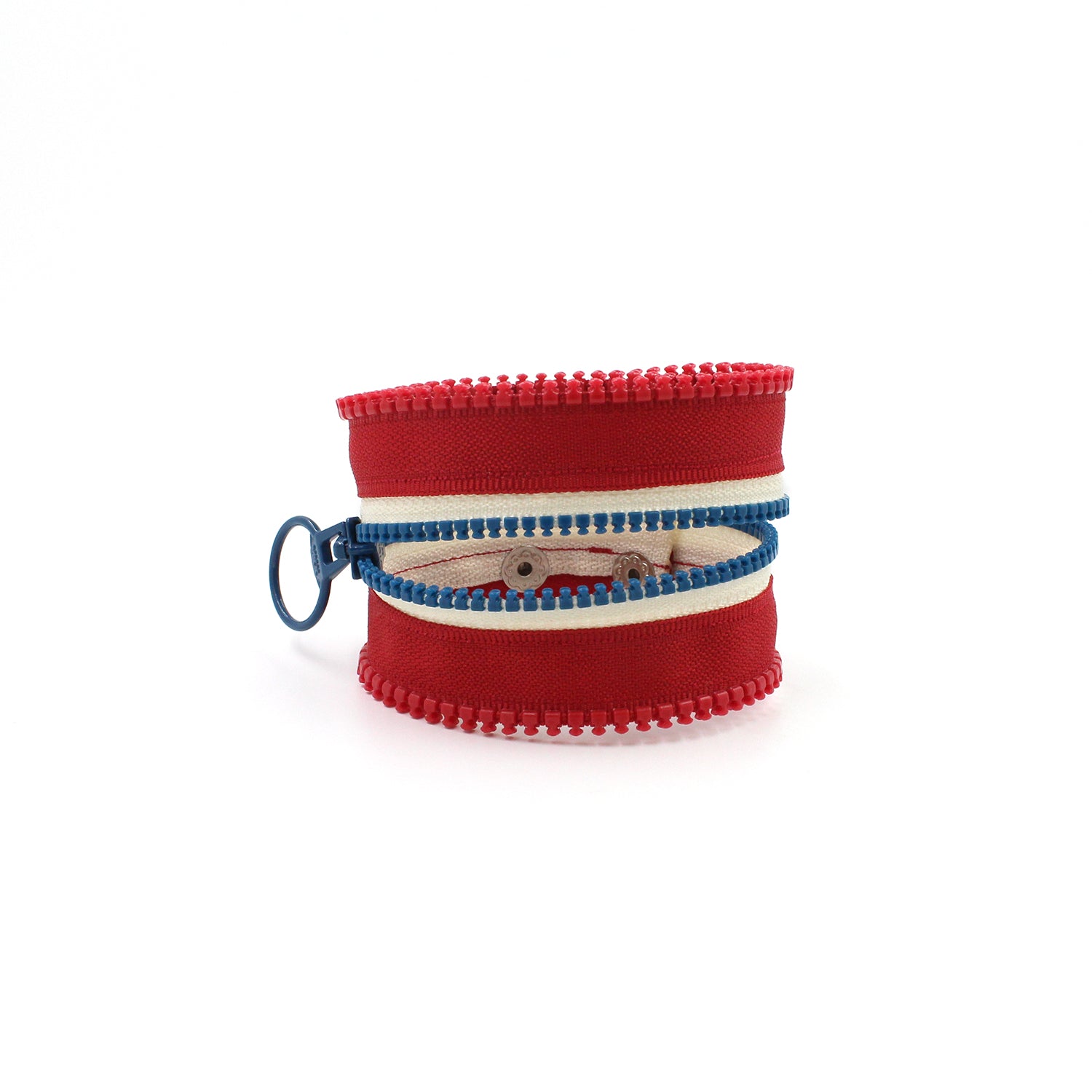 Cream inner zipper with blue teeth. Red outer zipper with red teeth. Red topstitch. Nickel snaps. Blue ring zipper pull.