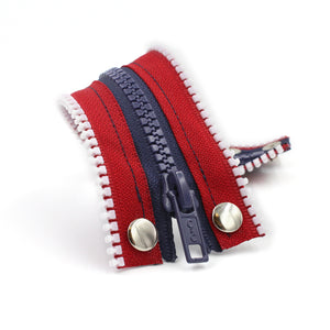 Navy blue inner zipper with navy blue teeth. Red outer zipper with white teeth. Navy blue topstitch. Nickel snaps. Navy blue classic zipper pull.