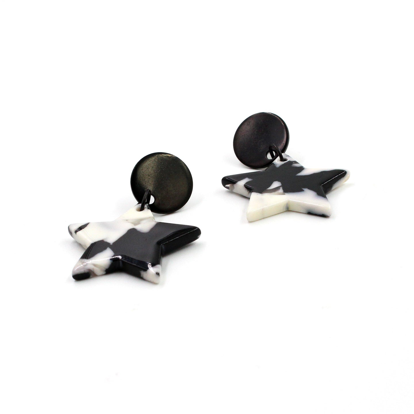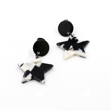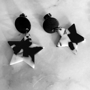 Handmade acrylic laser-cut black and white mosaic stars dangle earrings, black coated stainless steel posts with push-back closure.