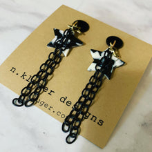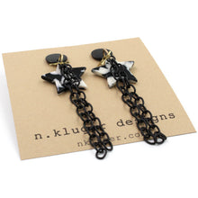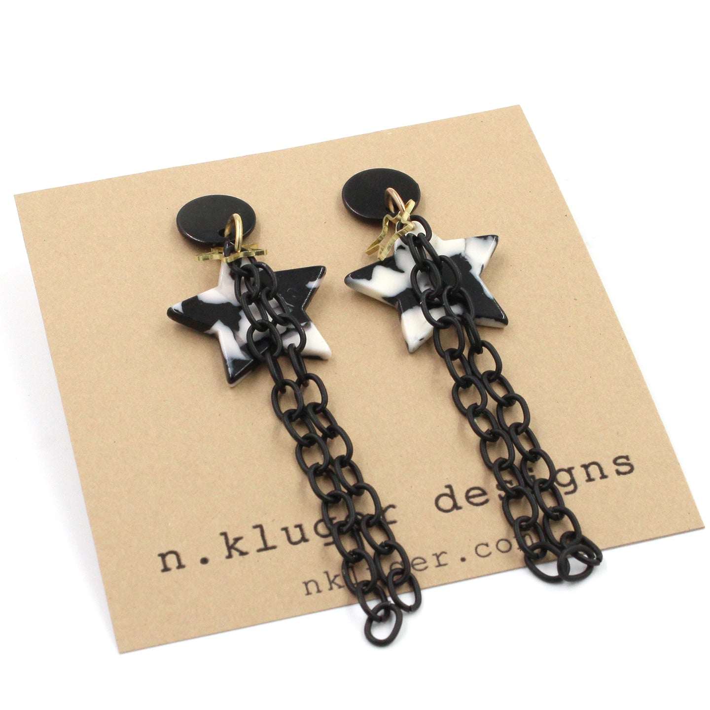 Handmade acrylic laser-cut black and white mosaic stars dangle earrings with gold stars layered on top, black stainless steel push back closures.