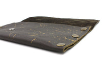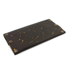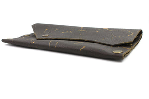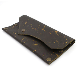 Handmade one-of-a-kind small brown leather clutch with antique gold snaps and gold splatter paint.