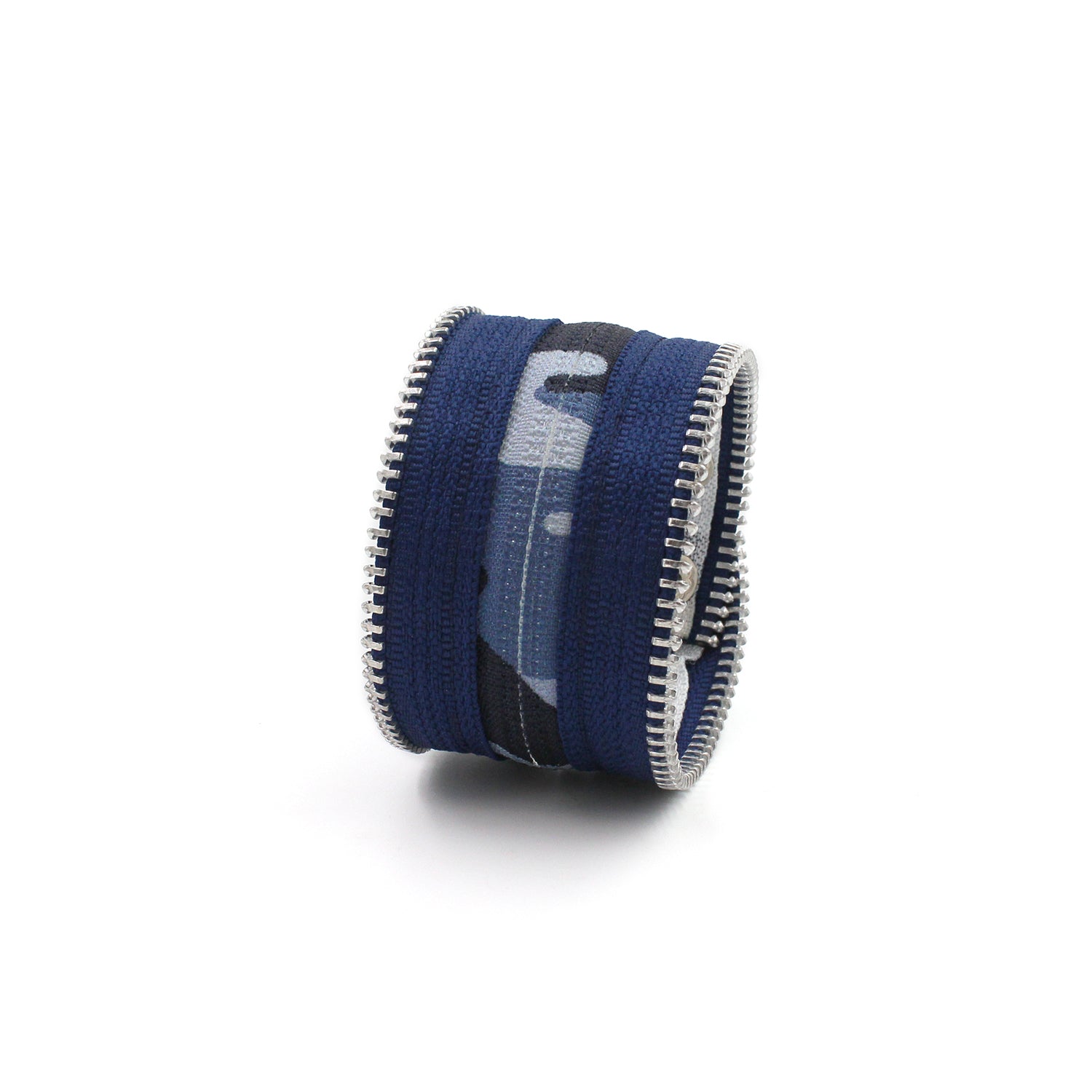 Blue camouflage inner zipper with clear teeth. Blue outer zipper with nickel teeth. Navy topstitch. Nickel snaps. Nickel zipper pull.