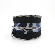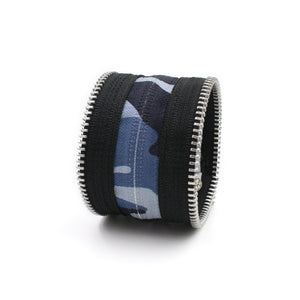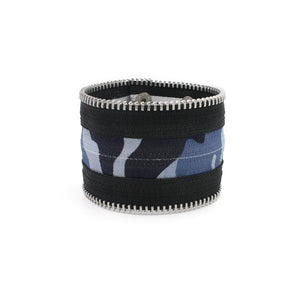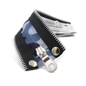 Blue camouflage inner zipper with clear teeth. Black outer zipper with nickel teeth. Black topstitch. Nickel snaps. Nickel zipper pull.