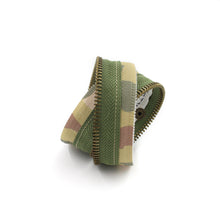 Khaki/Green camouflage inner zipper with clear teeth. Olive green outer zipper with antique gold teeth. Cream topstitch. Antique gold snaps. Nickel zipper pull.