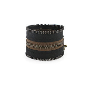 Love this gender-neutral look of mixing brown, black and antique gold! brown inner zipper with antique gold teeth.  Black outer zipper with gunmetal teeth. Black topstitch.  Antique gold snaps. Antique gold zipper pull with antique gold Greek cross charm. Bracelet width: 1.75" Size: Adjustable 2 ways -...