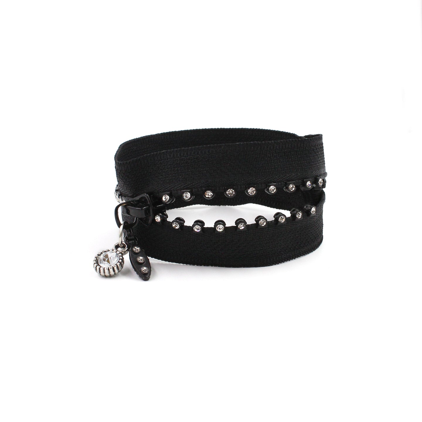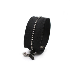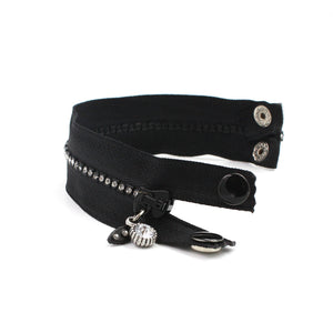 Wear this one with to sip cocktails or to dress up jeans. Single no-sew black zipper bracelet with crystal teeth.  Black snaps. Crystal zipper pull with crystal charm. Bracelet width: 1" Size: 7.5" (Medium/Large)