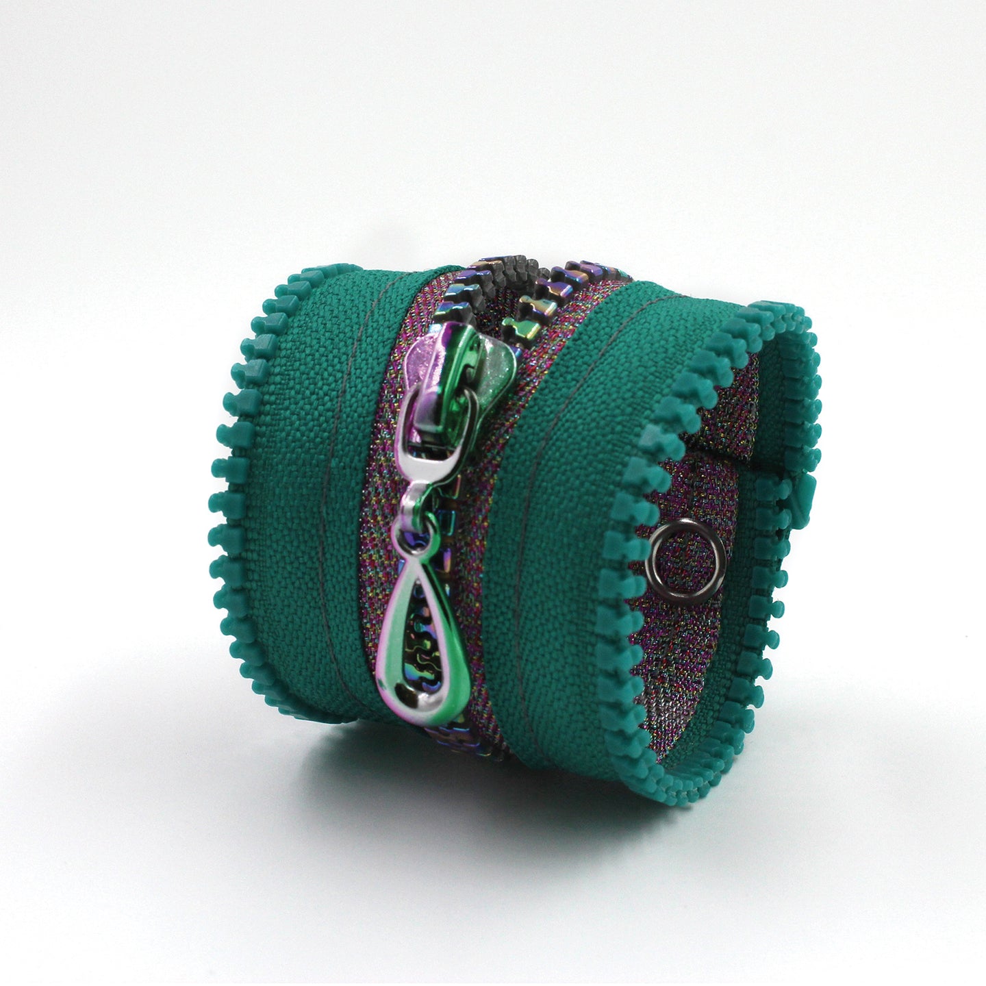 Pink metallic inner zipper with pink metallic teeth. Teal outer zipper with teal teeth. Teal topstitch. Nickel snaps. Metallic matching zipper pull.