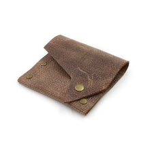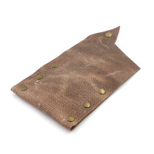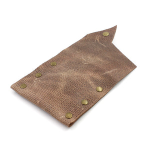 Handmade genuine distressed brown leather coin purse/money holder with antique gold-colored rivets. Antique gold snap closure. Brown suede interior.