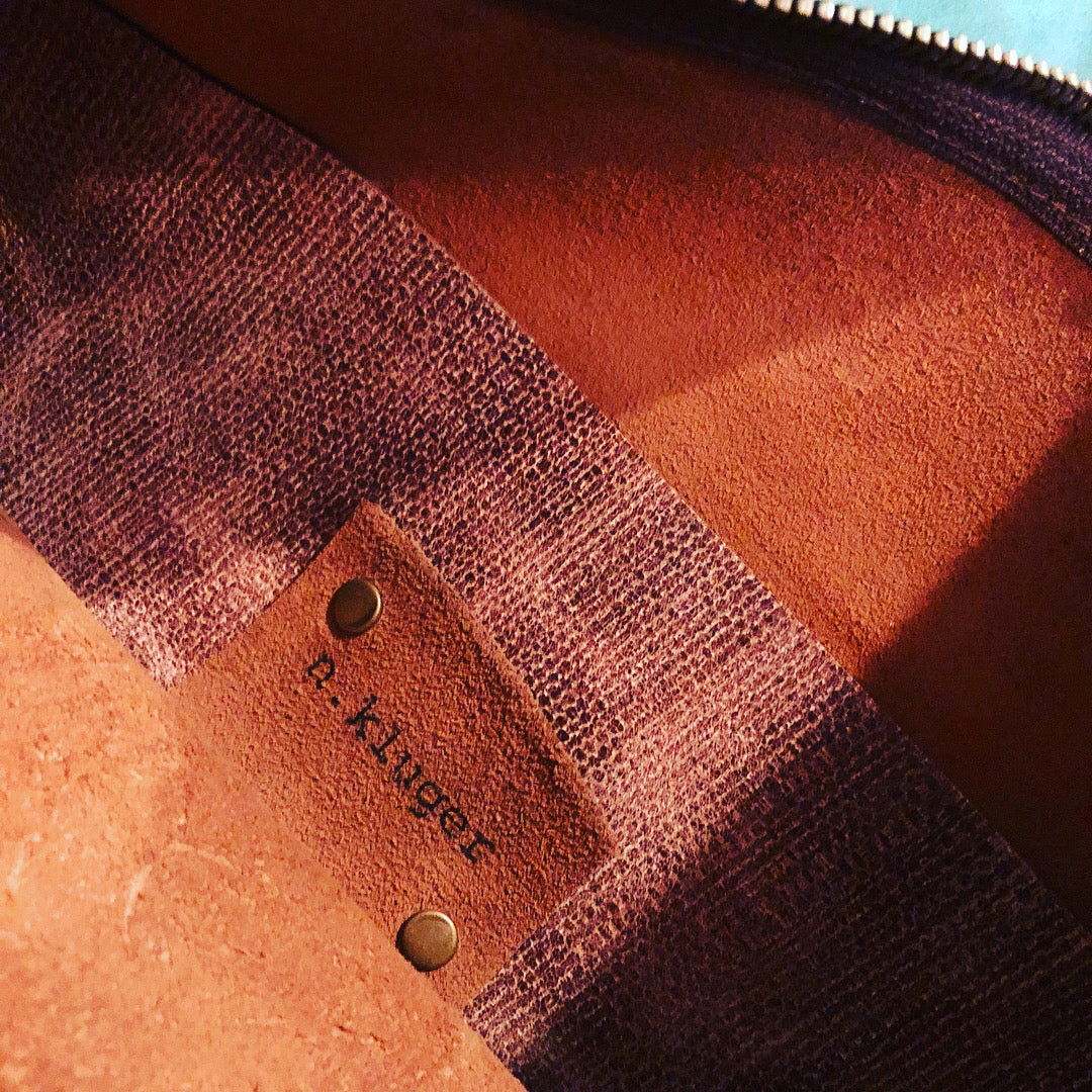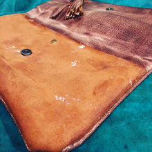 Handmade from fine genuine leather. Foldover clutch with front pocket with snap closure. Foldover has brown zipper opening, magnetic closure on fold and a leather interior pocket. Handmade tassle on zipper pull.