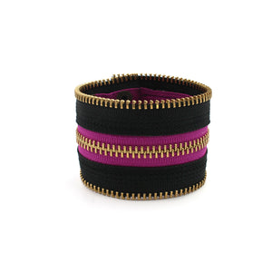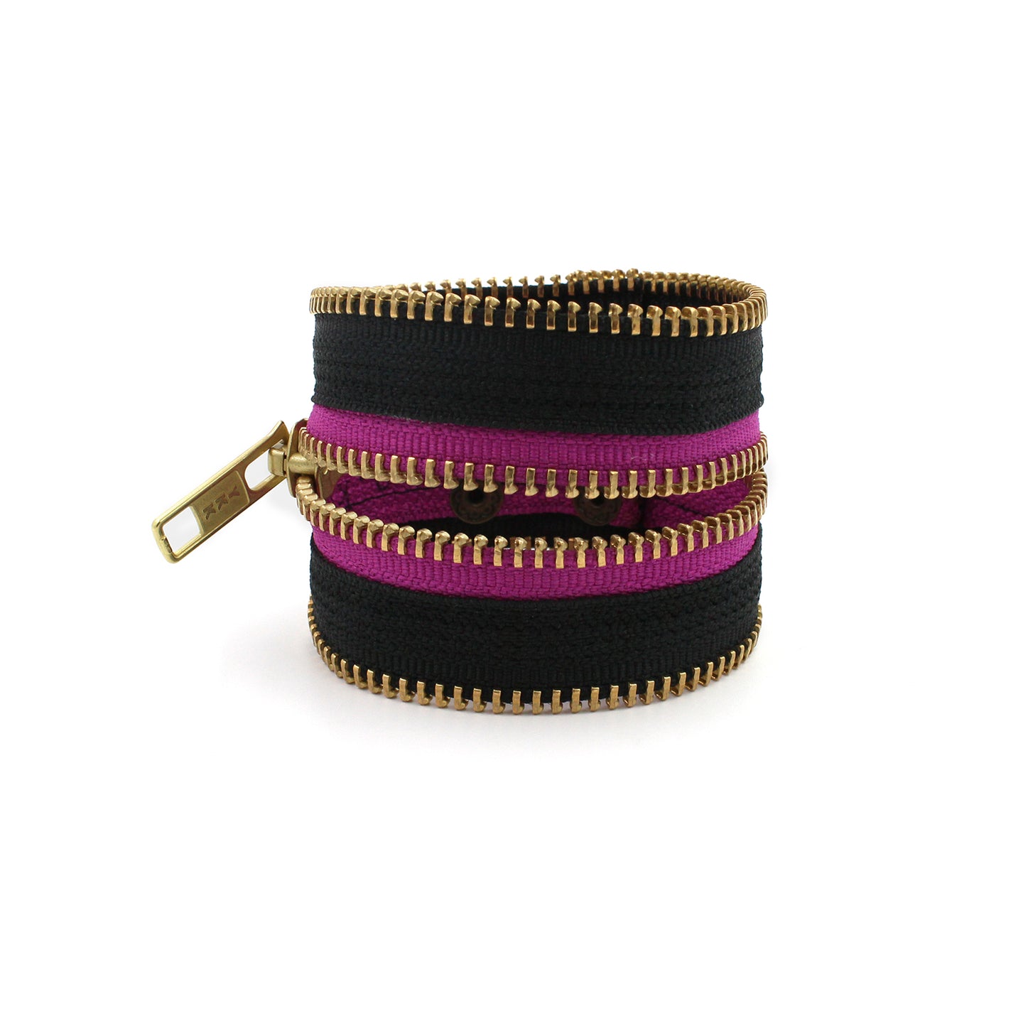 Be bold and move forward zipper bracelet. Bright fuschia inner zipper with brass teeth.  Black outer zipper with brass teeth. Black topstitch.  Antique gold snaps. Brass classic zipper pull. Wear it 3 ways!  Closed, Open & Twisted!   Bracelet width: 1.75" Size: Adjustable 2 ways - 6.75" and 7.5"...