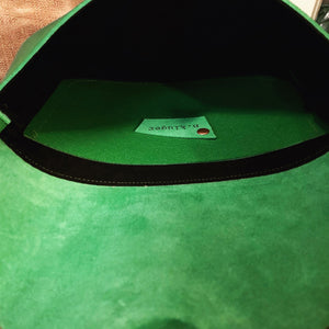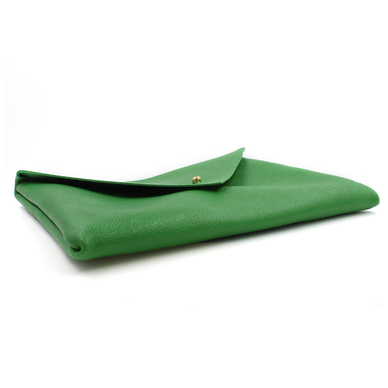 This gorgeous kelly green is everything! Handmade from fine genuine Italian leather. Leather interior flap. Black lining. Green leather interior pocket. Matte gold closure and matte gold rivets. Measures 9.5" wide x 8" height x 1" width. This bag can...