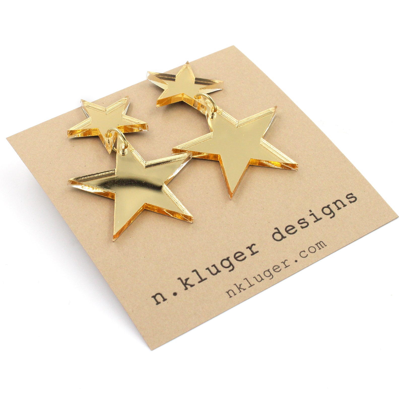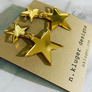 Handmade acrylic laser-cut gold mirror double star drop earrings on pushback stainless steel posts.