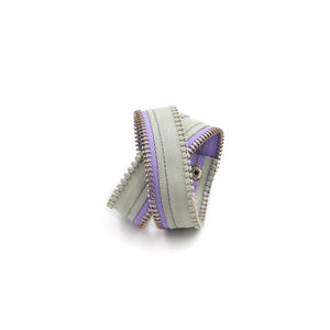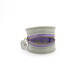 Lilac purple inner zipper with nickel teeth. Light grey outer zipper with light grey teeth. Grey topstitch. Nickel snaps. Silver heart zipper pull charm.
