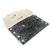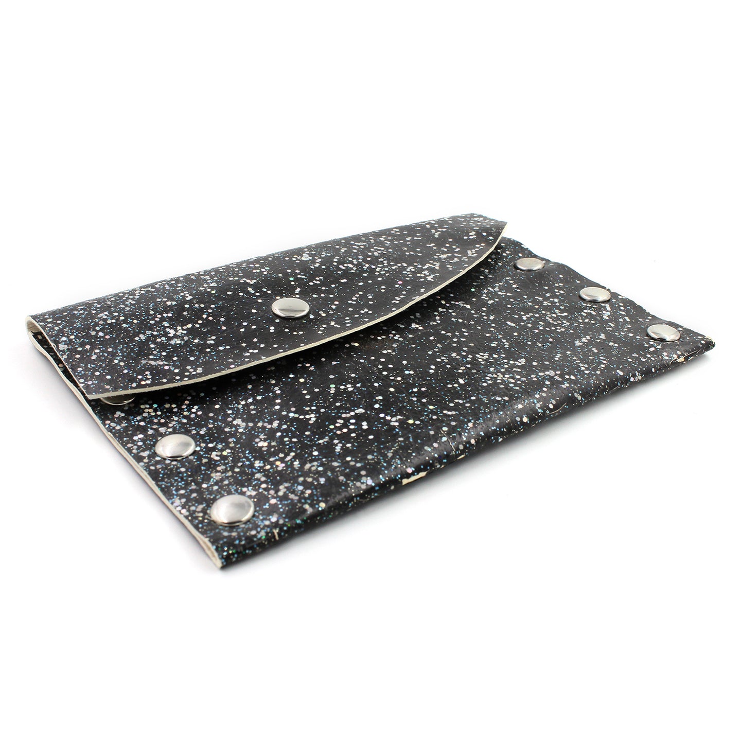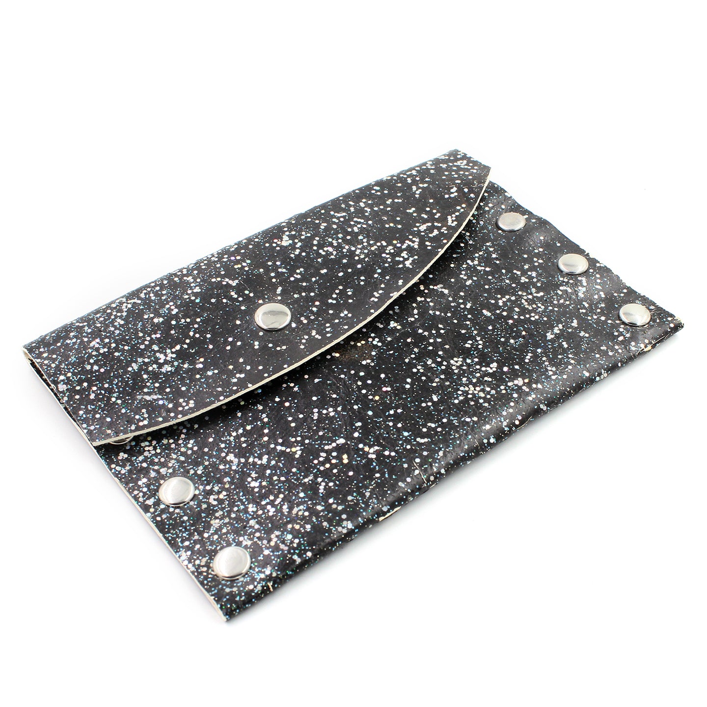 Handmade leather business card/credit card case/mini wallet in hand-decorated black Italian leather with embedded glitter, silver rivets. Silver snap closure.