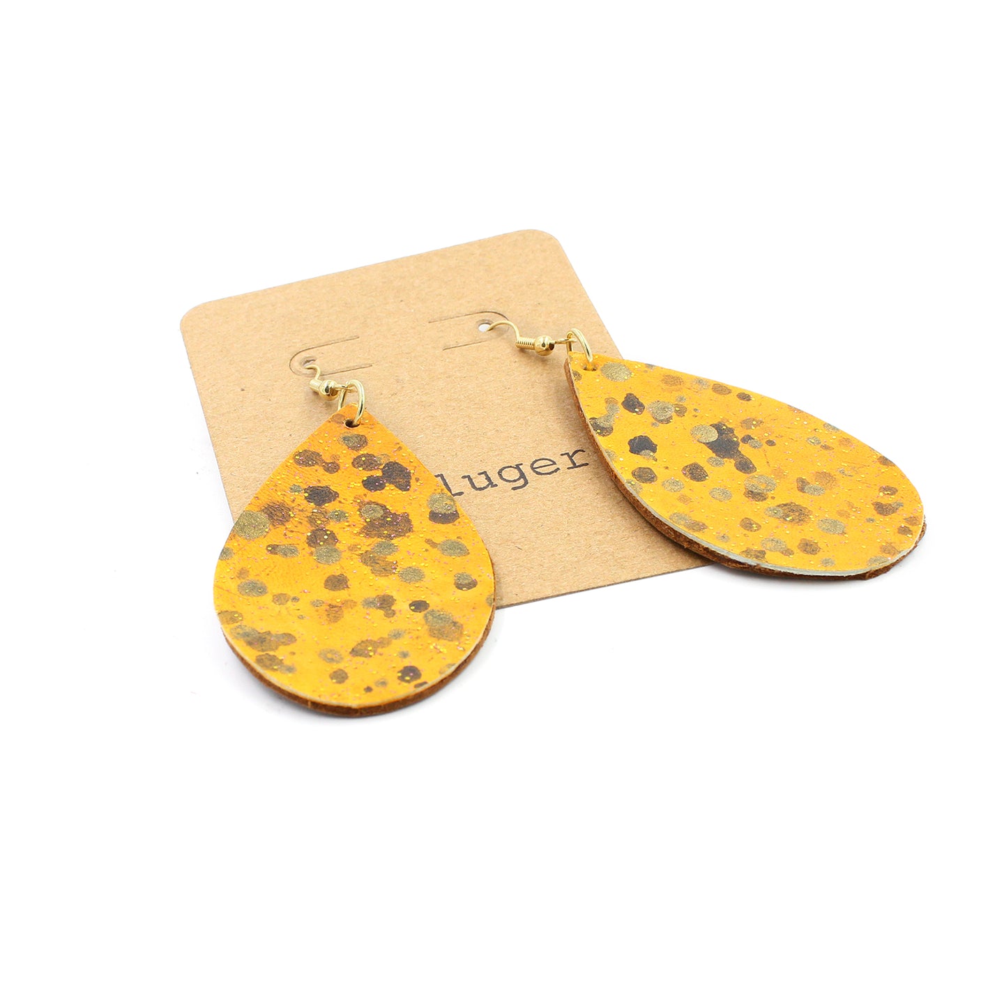 Hand-decorated glittery tangerine Italian genuine leather earrings with brown leather backside. Nickel-free gold-plated posts. Size: 3" total drop. 1.5" width at widest point.