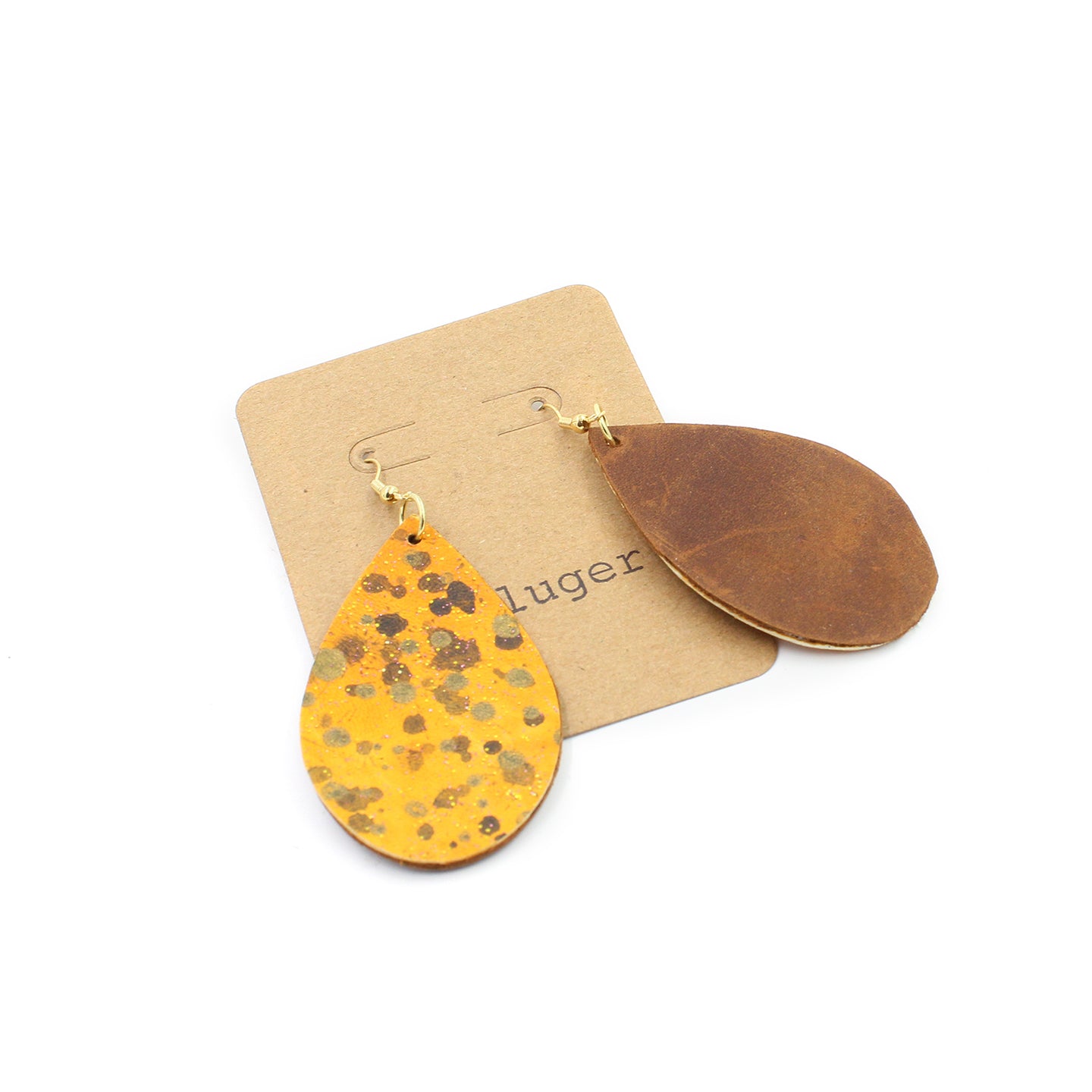 Hand-decorated glittery tangerine Italian genuine leather earrings with brown leather backside.
