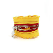 Red inner zipper with nickel teeth. Yellow outer zipper with yellow teeth. Red topstitch. Nickel snaps. Silver puzzle piece zipper pull charm.