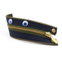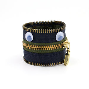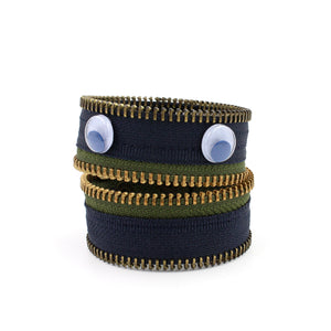 Olive green inner zipper with antique gold teeth. Navy blue outer zipper with antique gold teeth. Navy blue topstitch. Antique gold snaps. Blue Monster Eyes. Brass zipper pull.