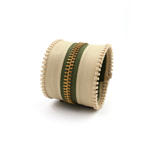 Any neutral gal's dream. Olive green inner zipper with brass teeth.  Beige outer zipper with beige teeth. Beige topstitch.  Antique gold snaps. Brass zipper pull with antique gold key charm. Bracelet width: 1.75" Size: Adjustable 2 ways - 5.75" and 6.5" (Small)