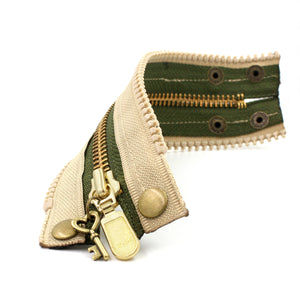 Olive green inner zipper with brass teeth.  Beige outer zipper with beige teeth. Beige topstitch.  Antique gold snaps. Brass zipper pull with antique gold key charm.