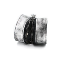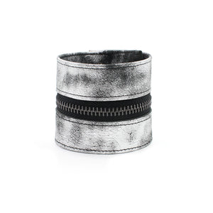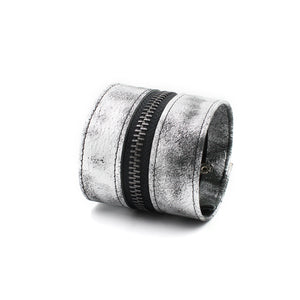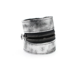 Distressed soft metallic silver/gunmetal wide leather zipper bracelet.