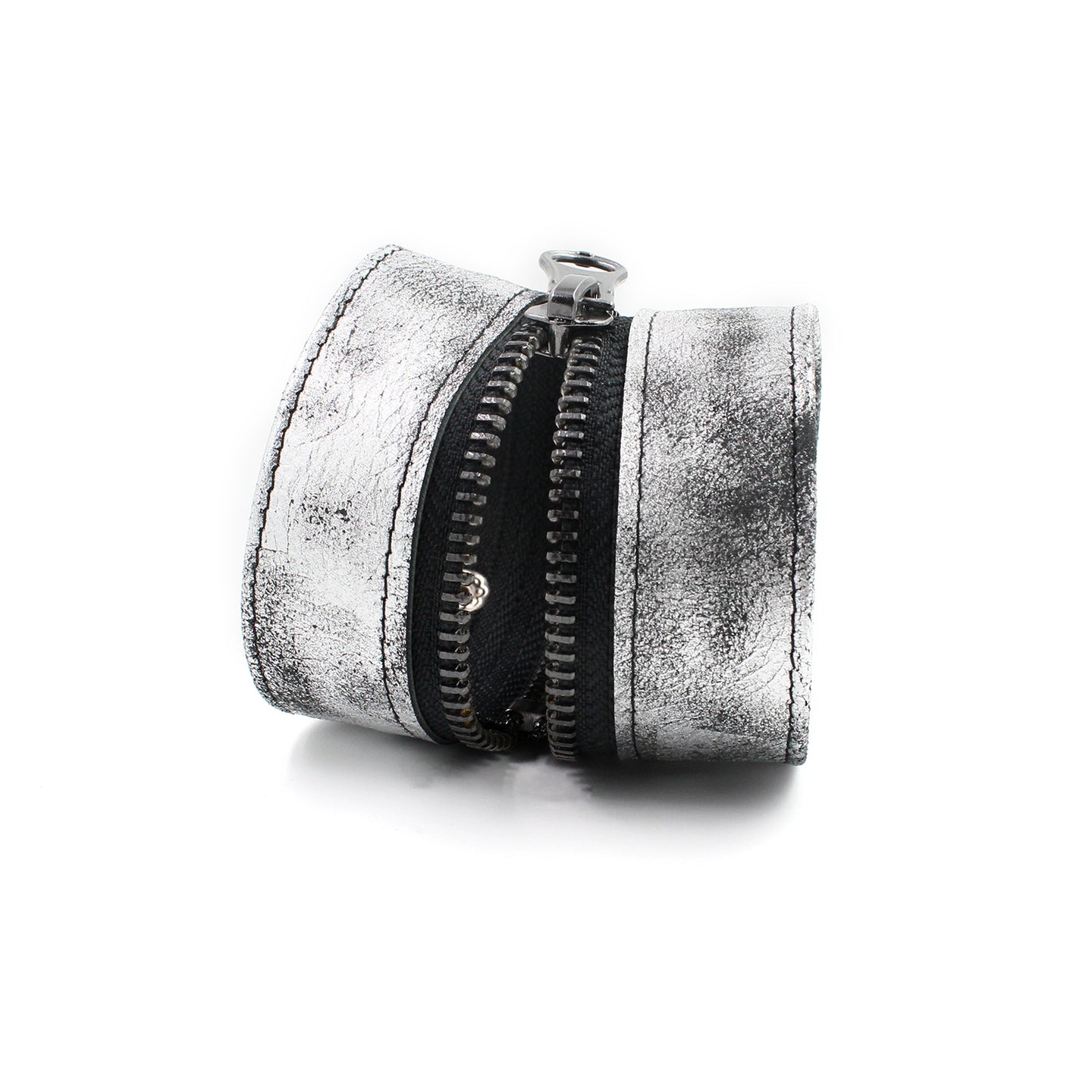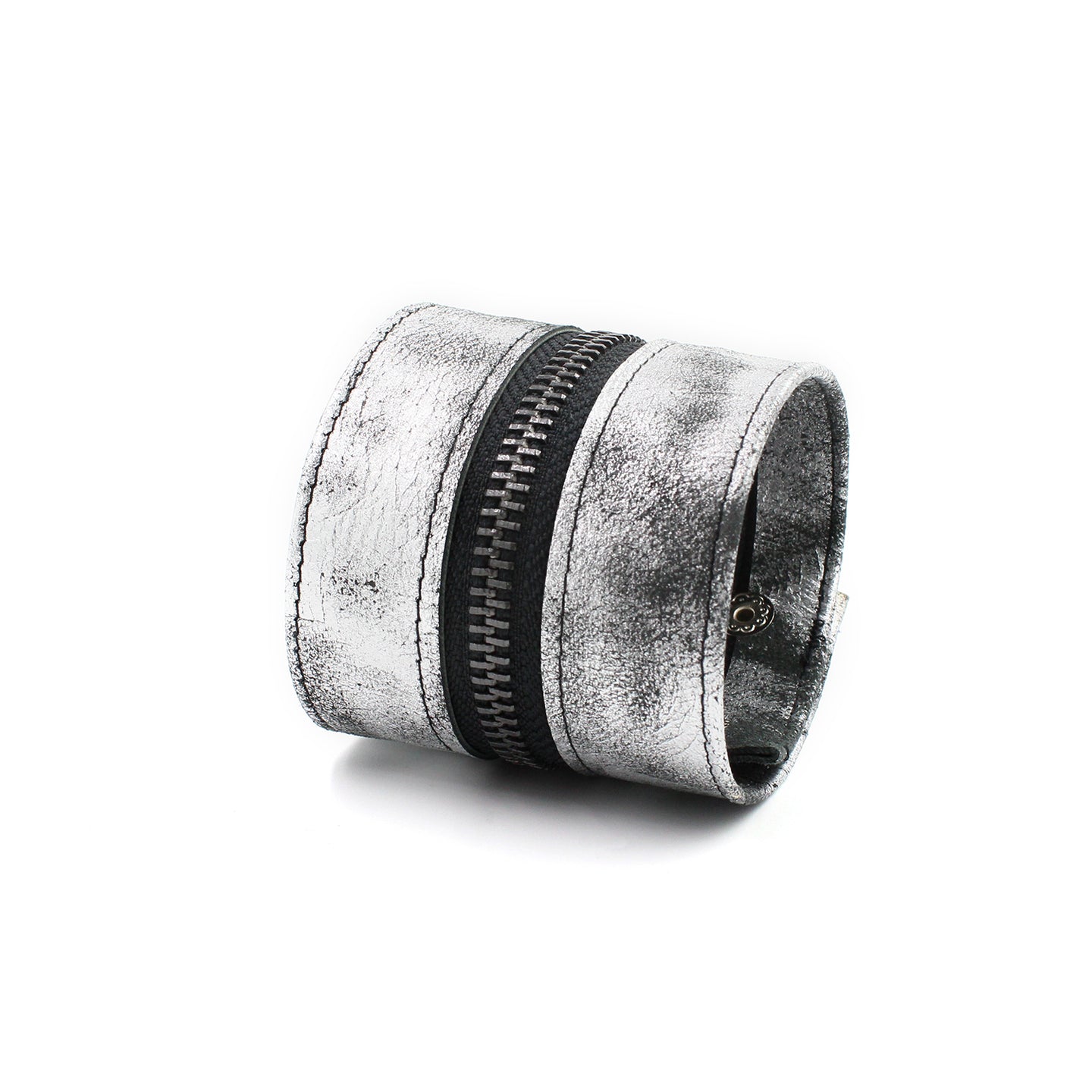 Black inner zipper with gunmetal teeth. Genuine distressed metallic silver/black leather outer bracelet. Black topstitch. Black snaps. Gunmetal classic zipper pull.