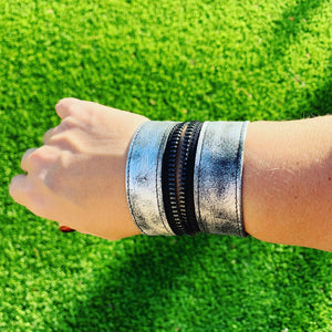 Metallic Silver Gunmetal Leather "Zither" Zip Bracelet