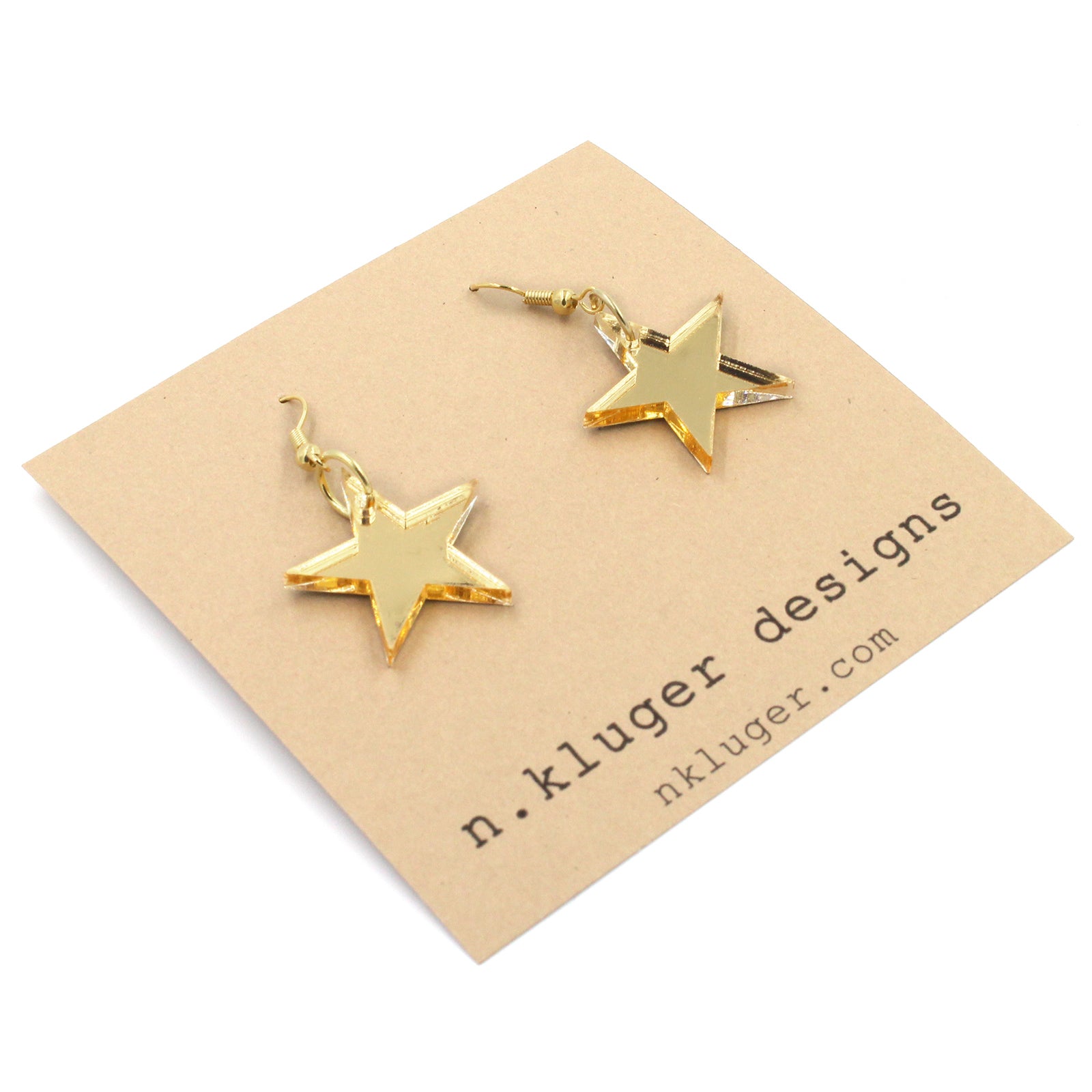 Handmade miniature acrylic laser-cut gold mirrored star drop earrings on nickel-free earring wires.