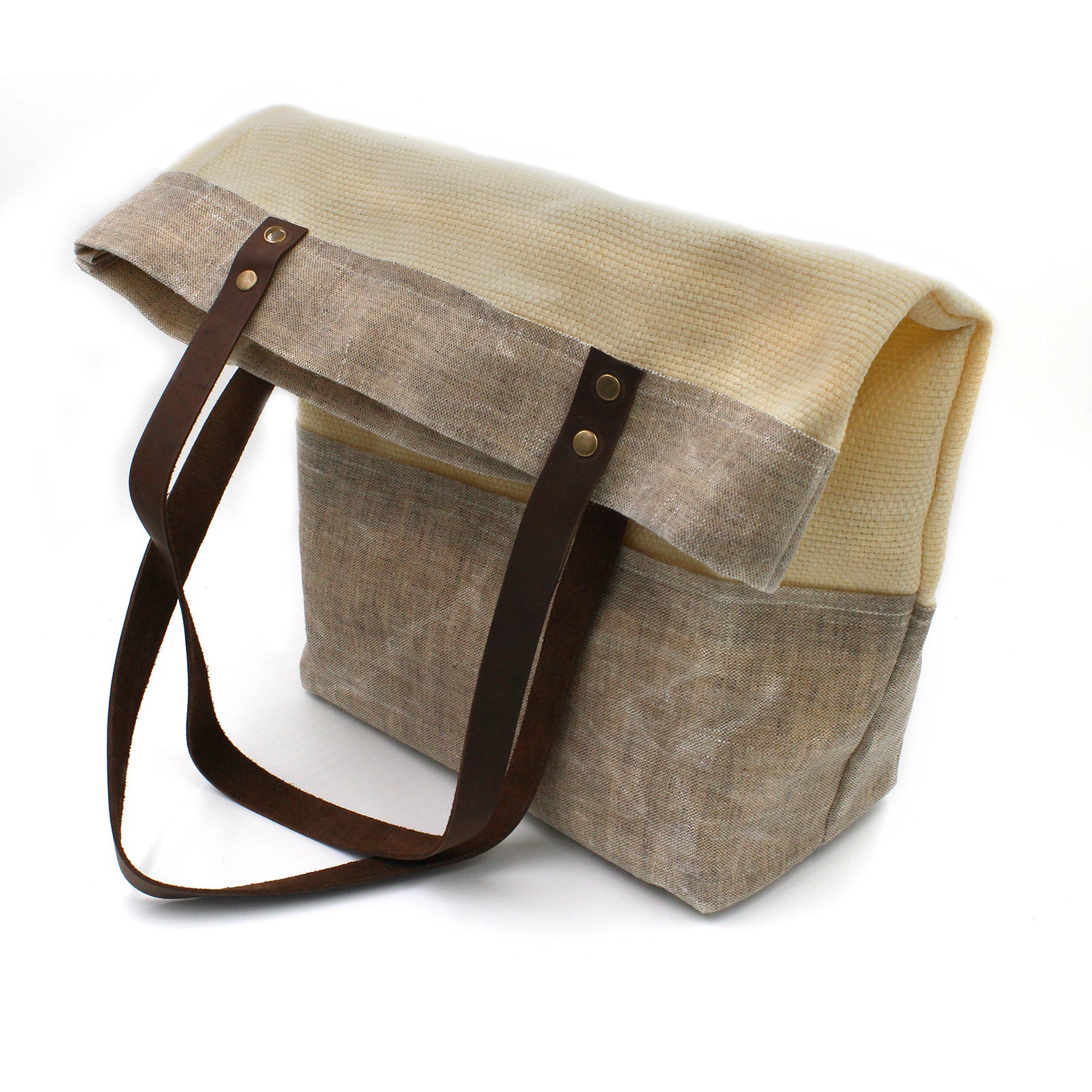 Handmade totebag/shopper from high-quality natural basketweave waxed canvas material, waxed linen trim and fine genuine brown leather straps with antique gold rivets. Waxed linen interior pocket. Waxed linen removable bottom insert.
