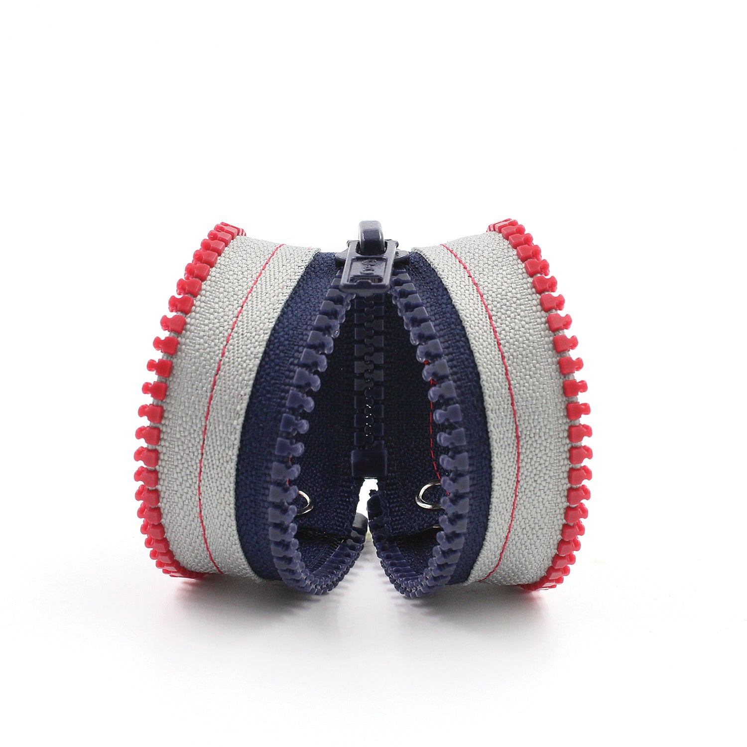 Navy inner zipper with navy teeth. Grey outer zipper with red teeth. Red topstitch. Nickel snaps. Navy classic zipper pull.