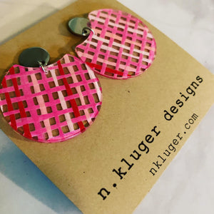 Handmade acrylic laser-cut pink basketweave circle cut-out drop earrings, stainless steel posts with push-back closure.
